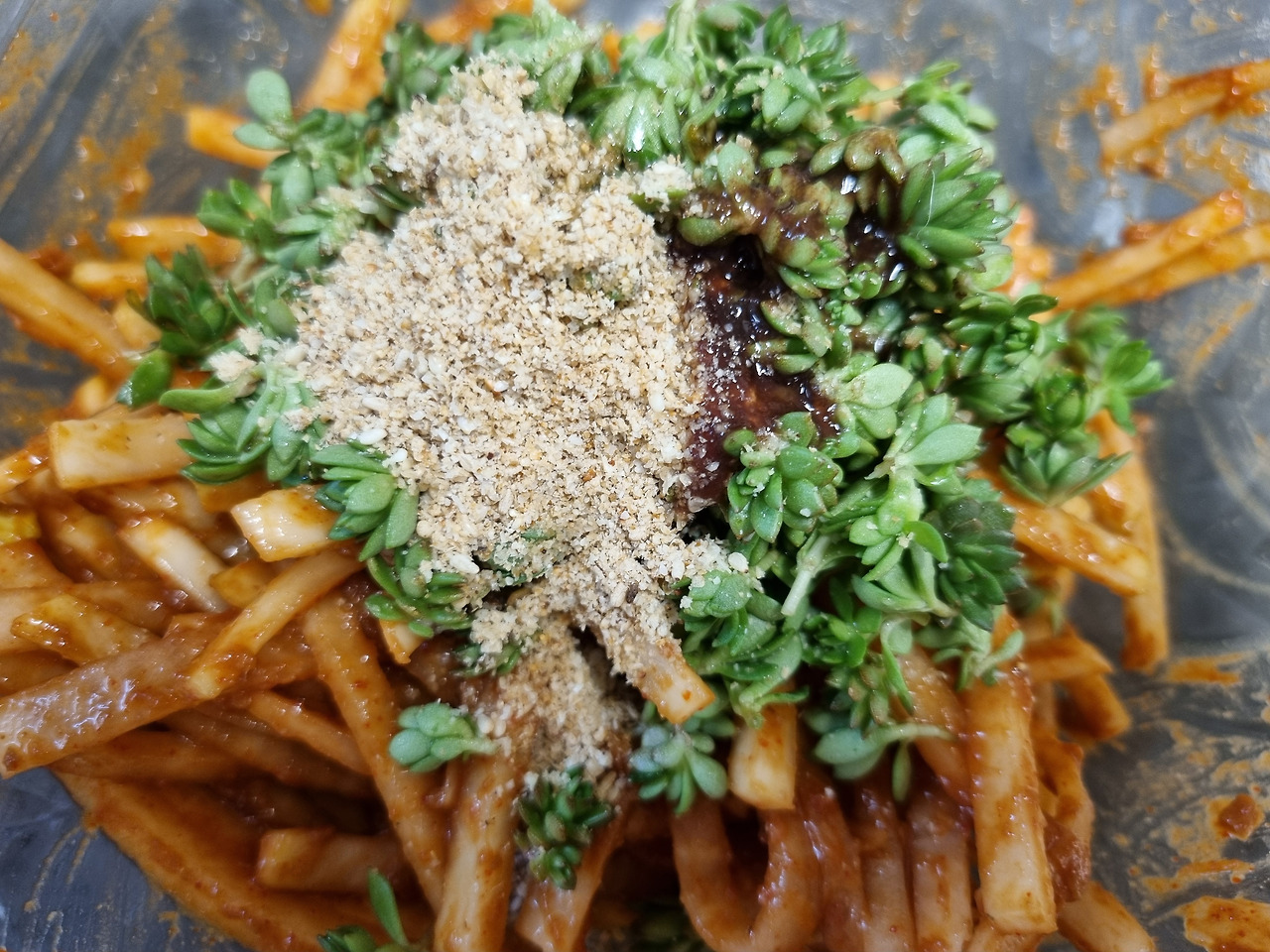 6. 조물조물 무친다. 무만 무친 다음에 돌나물을 넣어 휘리릭 버무려야 돌나물이 뭉개지지 않는다
