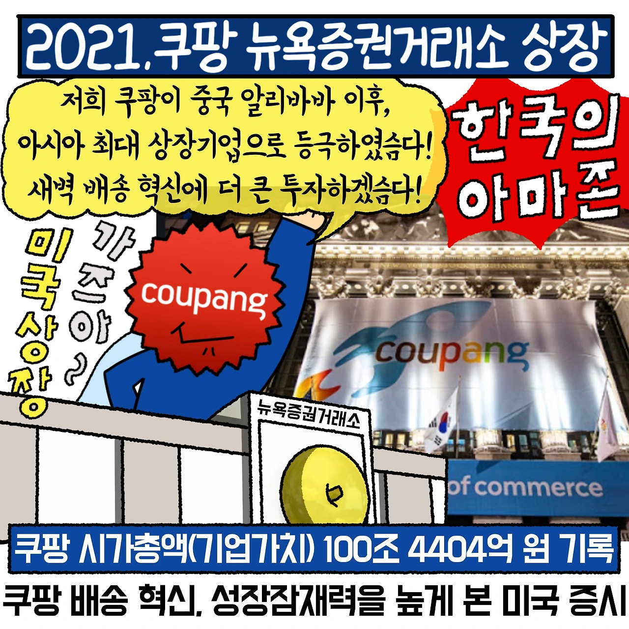 손정의의 투자와 배송 혁신으로 날개를 단 쿠팡은, 2021년 뉴욕증권거래소에 상장하게 됩니다. 미국 증시는 쿠팡의 새벽 배송 혁신과, 앞으로의 성장 잠재력을 높게 보았고, 쿠팡의 기업가치는 약 100조 4404억 원을 기록하게 됩니다. 이로써 쿠팡은 “한국의 아마존”이라 불리며 중국 알리바바 이후 아시아 최대 상장기업으로 등극하였습니다.