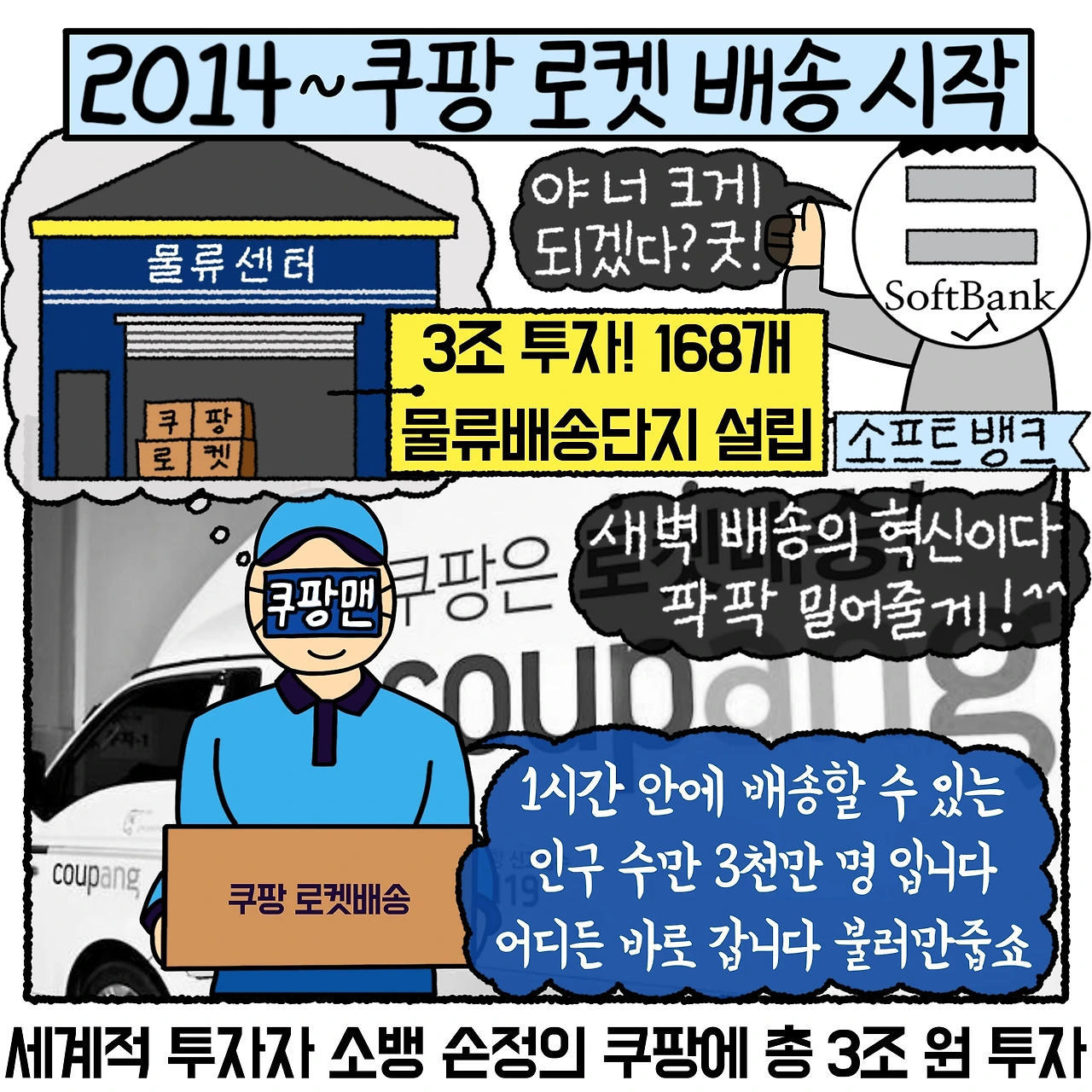 그런데 2014년부터 쿠팡이 로켓 배송을 시작하게 됩니다. 하루 전날 주문하면 다음 날 새벽 바로 받아볼 수 있는 쿠팡의 새벽 배송 혁신이 시작된 것이죠. 이를 위하여 쿠팡은 3조 원을 투자하여 168개의 물류배송단지를 설립하였고, 지역별 배송시스템, 새벽 배송에 필요한 수많은 배송기사와 택배 차를 구축하였습니다. 그렇게 쿠팡이 현재 1시간 안에 배송할 수 있는 인구 수만 3천만 명이라고 합니다. 이를 지켜보던 세계적 투자자 소프트뱅크 손정의는 2015년에 1조 원 투자를 시작하여 현재까지 쿠팡에 총 3조 원의 대규모 투자를 하게 됩니다.