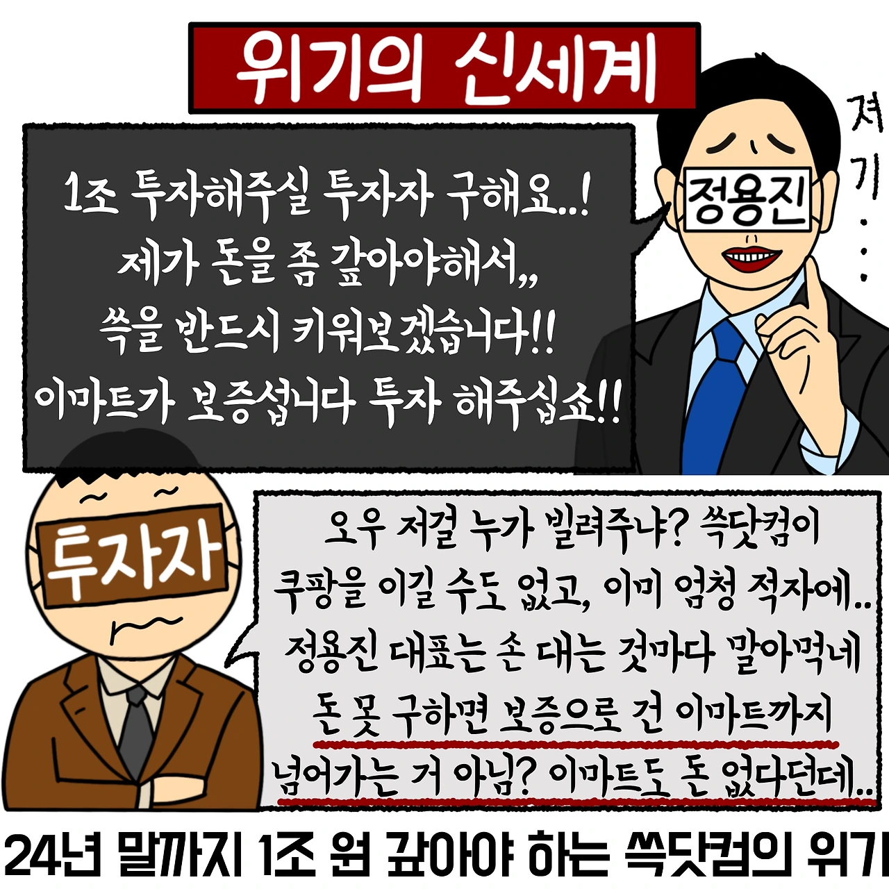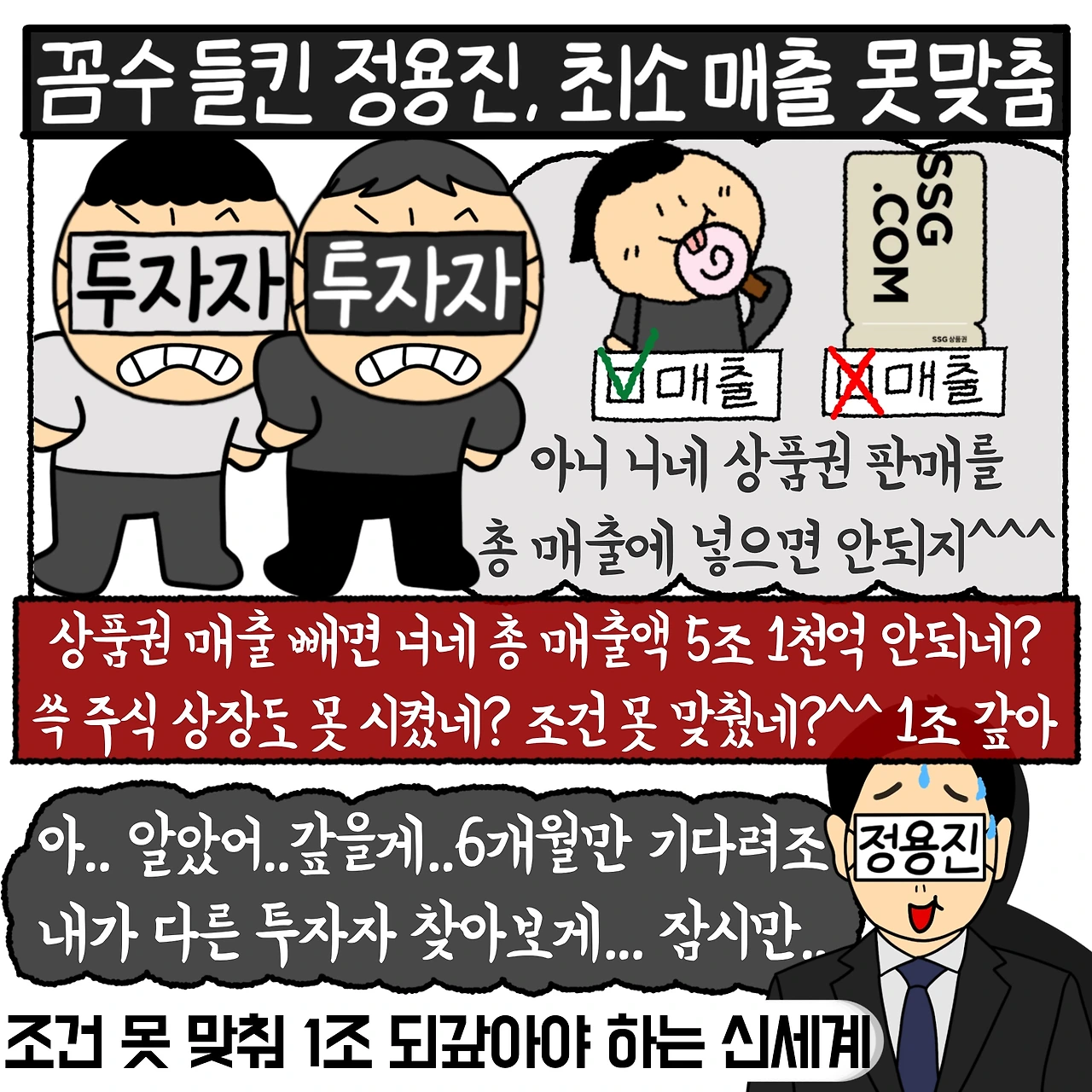 투자자들이 내건 조건(매출 5조 1천억 원, 시장 상장)을 맞추지 못한 쓱닷컴은 빌렸던 현금 1조 원을 되갚아야 하는 신세가 되었습니다.