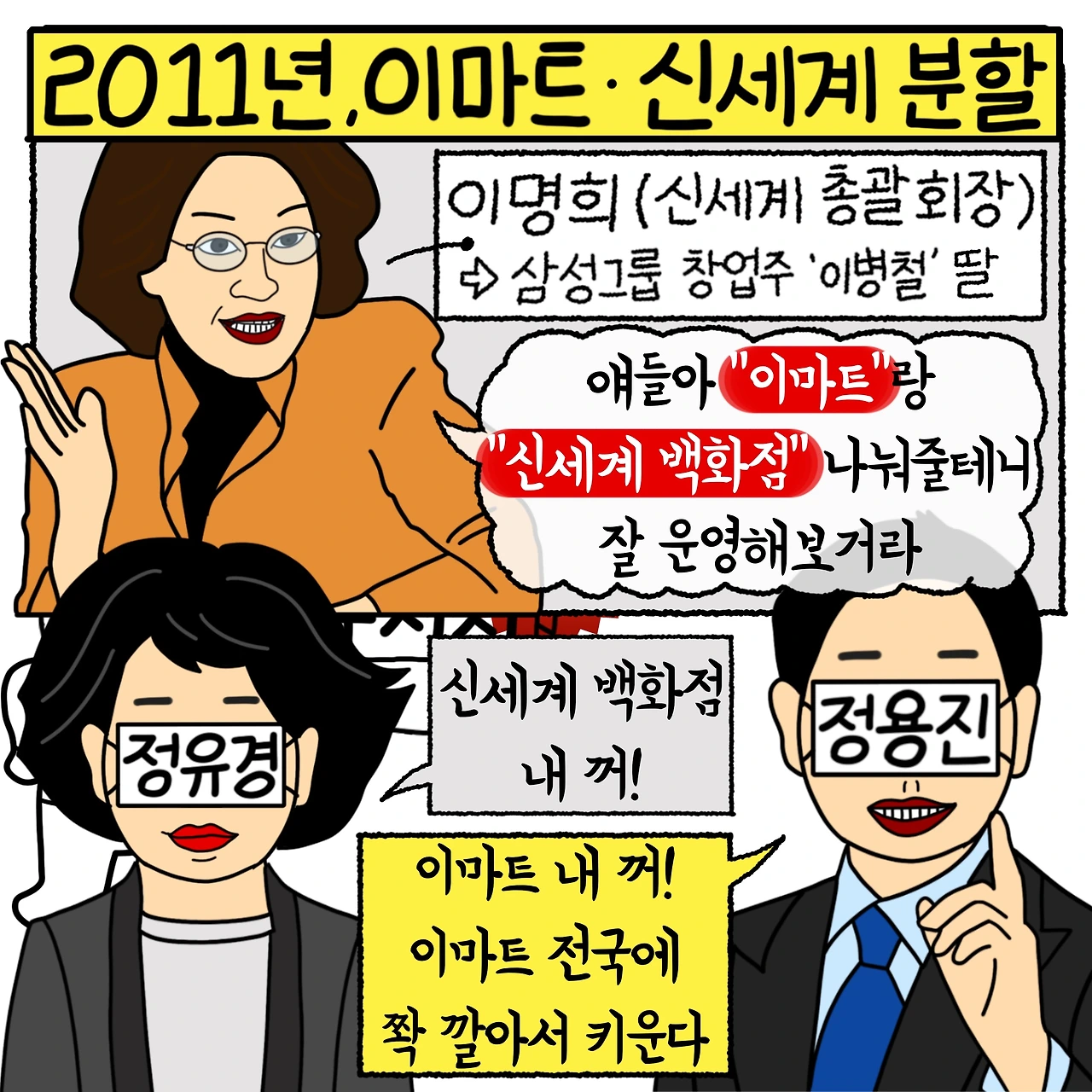 삼성그룹 창업주 “이병철“ 회장의 딸인 “이명희”는 신세계 그룹 총괄 회장입니다. “이명희”는 2011년 자신의 아들, 딸인 ‘정용진’과 ‘정유경’에게 각각 이마트와 신세계 백화점 경영을 맡겼습니다. 이마트 총괄대표가 된 정용진은 전국에 이마트를 쫙 깔아서 엄청난 확장을 달성했습니다.