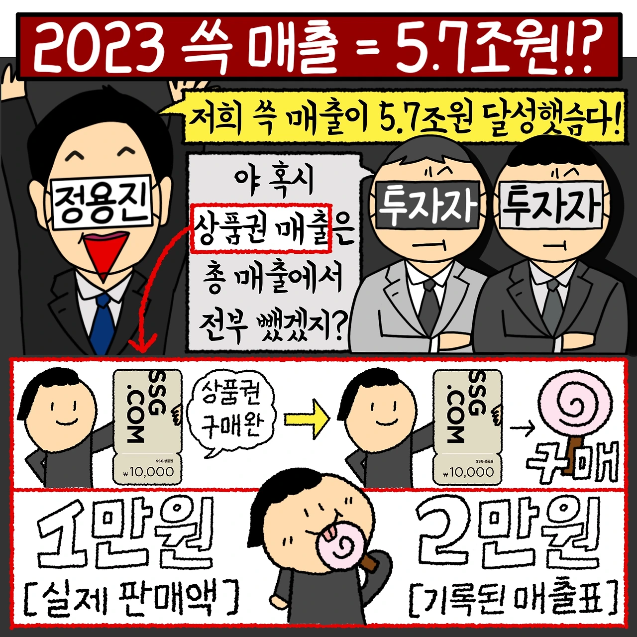 쓱닷컴은 23년 총매출액을 5조 7천억으로 발표했습니다. 하지만 이 매출표에는 “상품권 매출”이 포함된 상태였는데요! 상품권으로 물건을 사는 것이지, 상품권은 매출이 아닙니다. 이에 상품권이 이중으로 매출로 잡혔다는 것을 알아챈 투자자들은, 쓱 매출이 5조 1천억을 달성하지 못했다고 주장했습니다. 결국 쓱닷컴과 투자자들은 협상을 통해 24년 연말까지 다른 투자자의 투자를 받아 돈을 갚기로 합의했습니다.