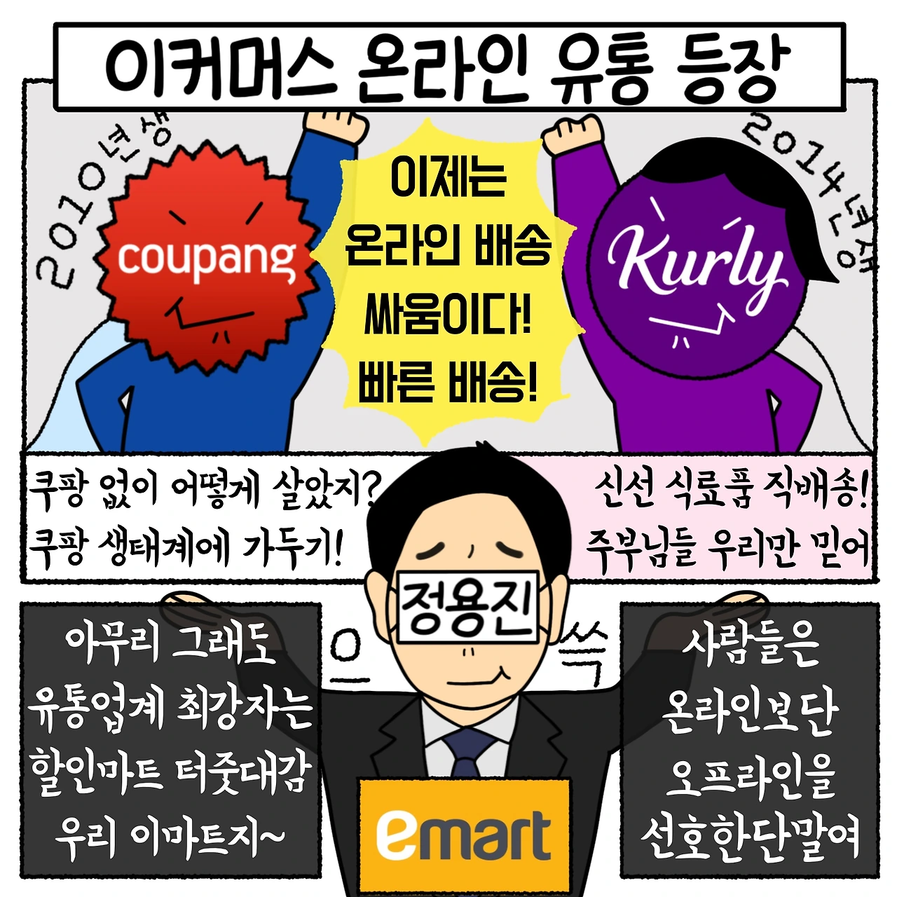 2010년 이후 쿠팡과 마켓컬리 등 많은 이커머스 업체가 등장하였습니다. “쿠팡 없이 어떻게 살았었지?” 쿠팡은 쿠팡 생태계에 소비자를 가두겠다는 모토를 가지고 등장하였고, 마켓컬리는 신선 식료품의 직배송을 약속하며 주부들의 환심을 이끌었죠! 처음 이커머스 업체들이 등장할 때 이마트 역시 “이마트몰”을 운영하고는 있었으나, 온라인 몰을 오프라인 할인매장의 보조 수단 정도로 활용하는 느낌이었죠! 이마트는 꽤 오래된 할인마트 최강자로서 온라인보단 오프라인에 힘을 더 많이 쓰고 있었습니다. 또한 신선식품을 온라인으로 배송한다는 것이, 그 당시엔 크게 받아들여지지 않을 것이라는 인식이 있었죠!