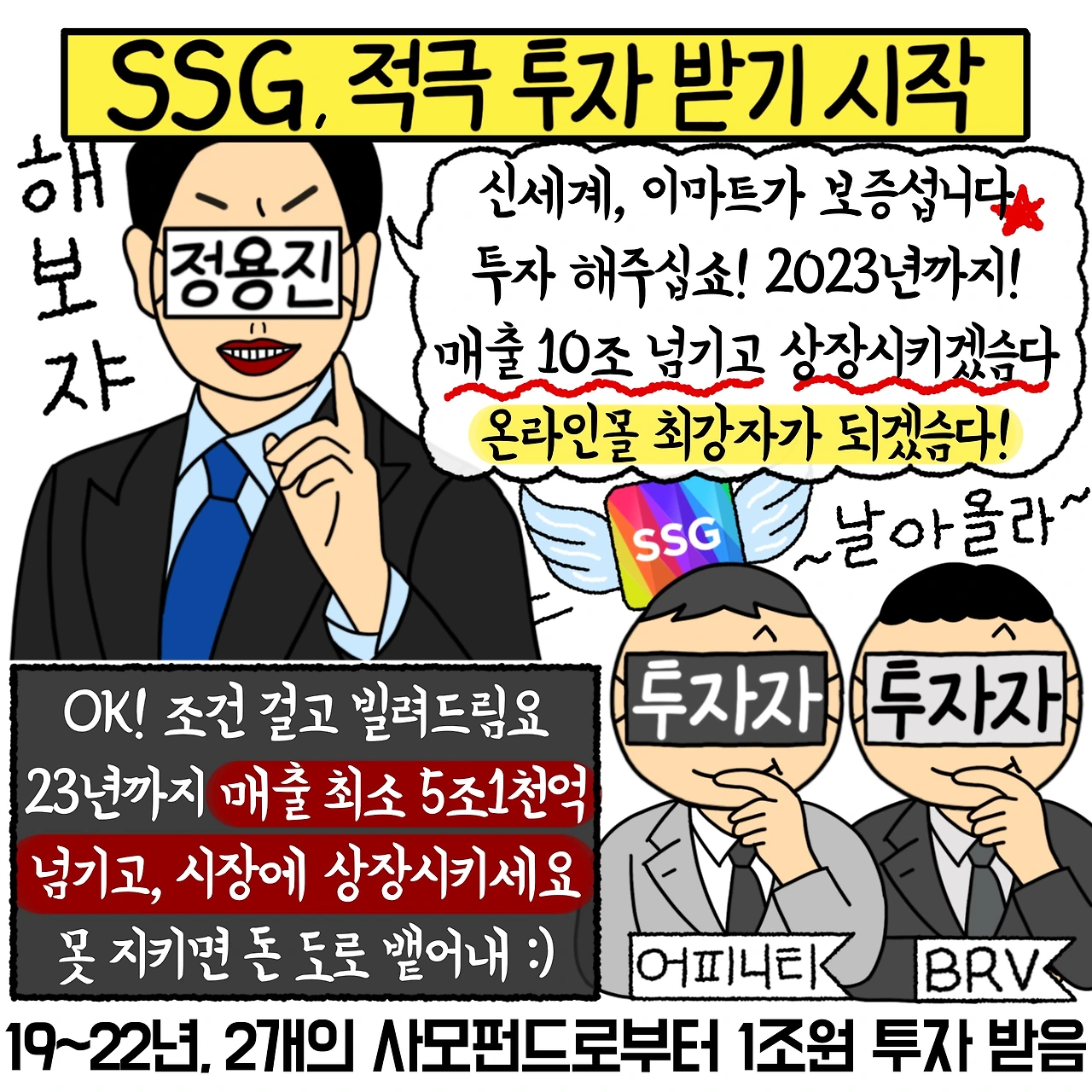 이에 쓱닷컴은 쿠팡을 뛰어넘어 이커머스 업계의 1등을 차지하기 위하여 본격 투자를 받기 시작합니다. 정용진은 2023년 쓱 매출액 10조 원 달성과 주식시장 상장[IPO]을 목표로 내걸었는데요! 사모펀드(투자자)는 투자 조건을 걸고 쓱닷컴에 투자하게 됩니다. 투자자들은 쓱닷컴이 목표로 내건 매출 10조 원의 절반인 5조 1천억 원의 매출과, 시장에 상장시킬 것을 조건으로 걸었습니다. 그렇게 쓱닷컴은 2019~2022년까지 2개의 홍콩 사모펀드로부터 1조 원을 투자받게 됩니다.
