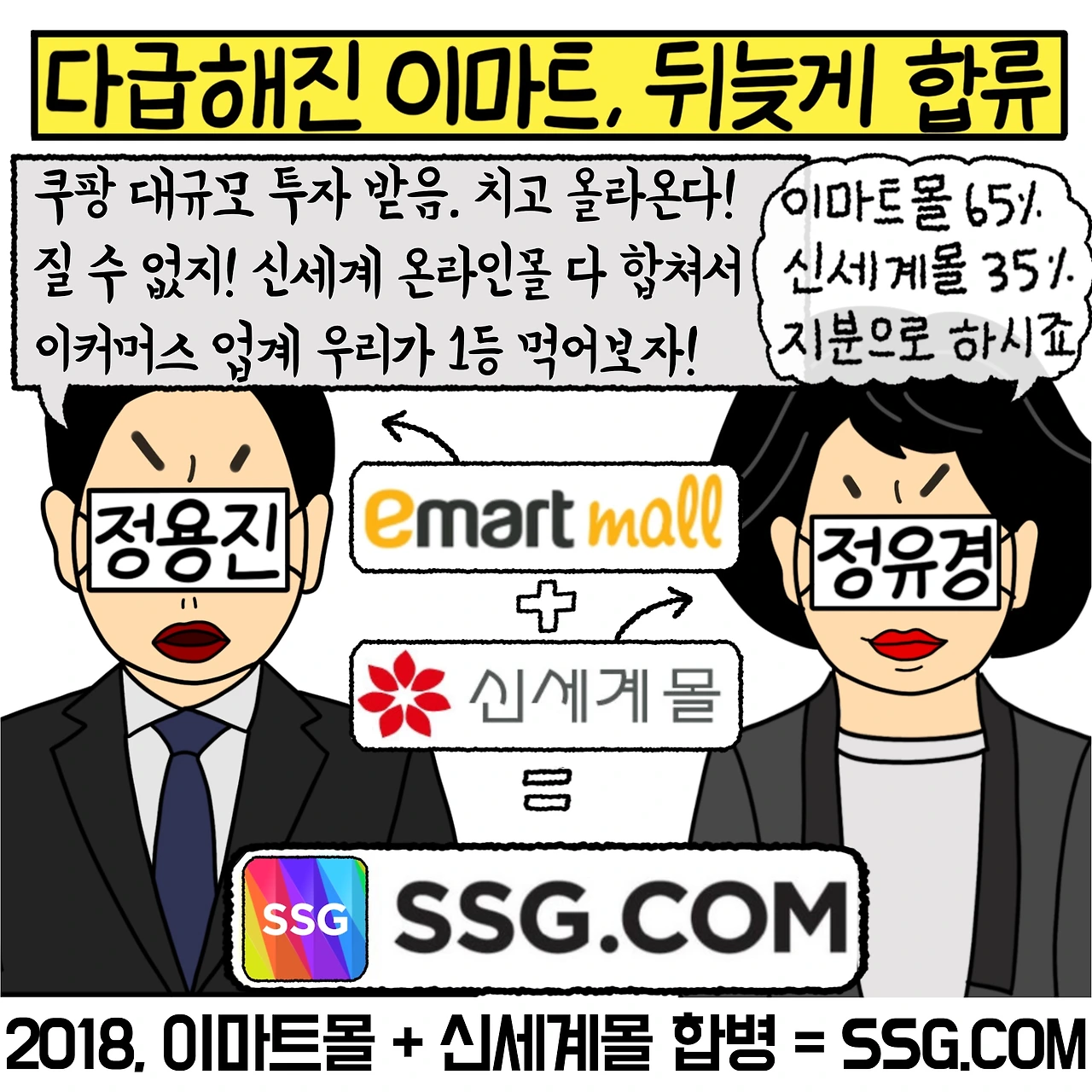 오프라인 할인매장에 집중하던 이마트는 업체들의 빠른 성장을 보고, 뒤늦게 이커머스 시장에 뛰어들게 됩니다. 신세계 그룹은 이마트몰과 신세계몰을 합친 SSG.COM을 출범하게 되죠! 이마트 65%, 신세계 35%의 지분으로 쓱닷컴을 만들었습니다. 2018년 뒤늦게 본격적으로 이커머스 업계에 뛰어든 것이죠.