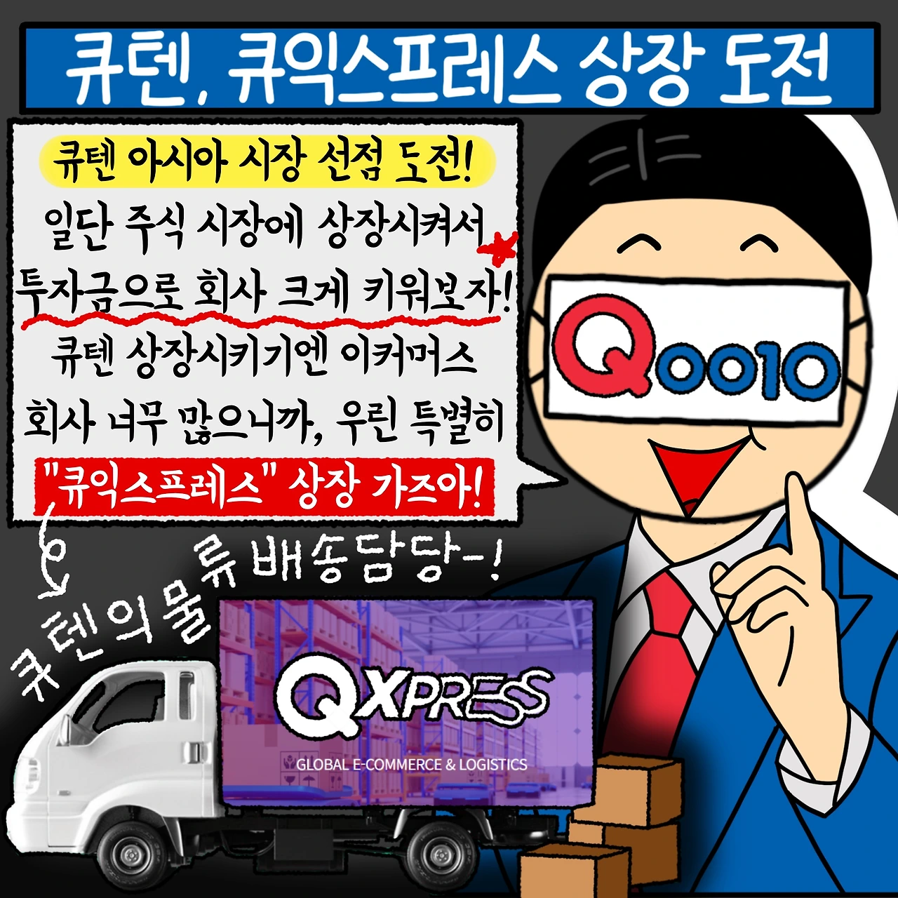 2009년 구영배는 이베이에 지마켓을 판매하였습니다. 이때 ‘겸업금지 조항‘ 옵션이 있어 국내에서는 10년 간 이커머스 유사 사업을 할 수 없게 됐죠! 그리하여 구영배는 싱가포르로 가서 <큐텐>이라는 이커머스 사업을 새로 시작하게 됩니다. 구영배는 포화 상태인 이커머스가 아닌 “물류 사업”으로 또 한 번의 나스닥 상장 신화를 만들고자 한 것으로 보입니다. 큐익스프레스를 상장시키기 위해선, 상당한 물량 확보가 필요했고, 이를 채우기 위해 2022년 한국으로 와서 공격적인 이커머스 인수합병을 시작하게 됩니다.
