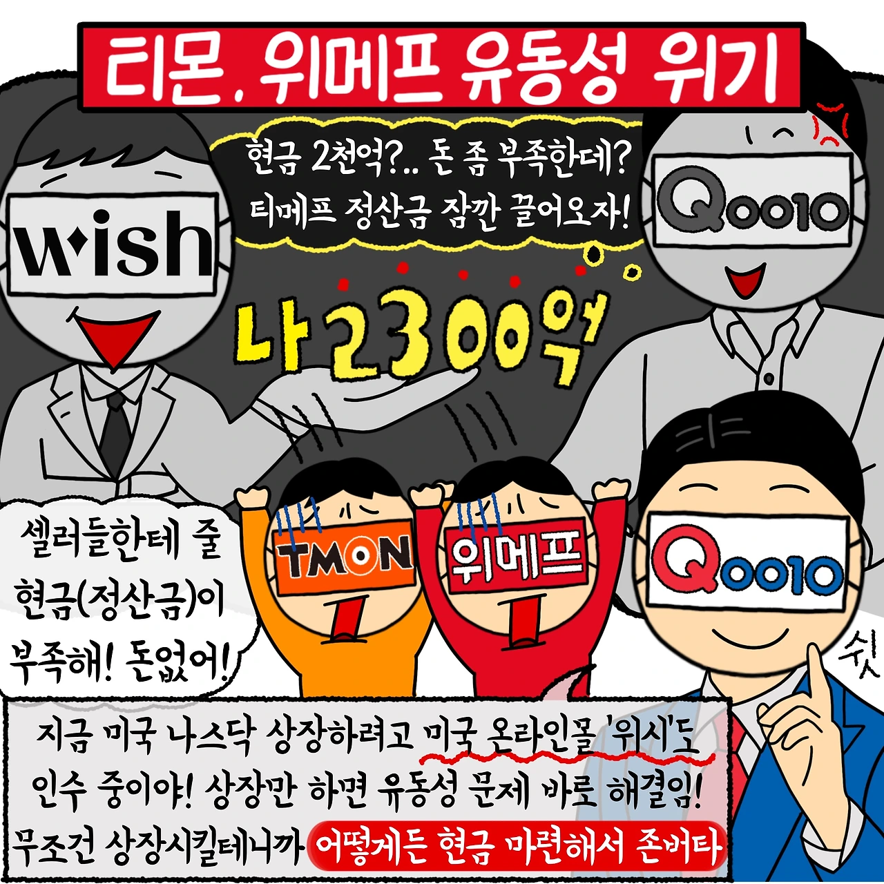 큐텐은 2024년 미국 온라인 몰 “위시”도 인수합병하게 됩니다. 미국 나스닥 상장을 위하여 “미국 이커머스 기업“도 전략적으로 인수한 것으로 보이는데요! 이 과정에서 큰 문제가 발생합니다. 앞서 이야기했듯, 큐텐 재무팀이 티메프의 돈 관리를 모두 담당하고 있었기에, 위시를 인수할 때 부족한 현금을 티메프의 ‘정산금’에서 빼와서 쓴 것이죠. 큐텐은 ‘일단 상장만 시키면’ 자본금이 들어와 유동성 문제는 바로 해결할 수 있다고 생각했던 것 같습니다. 그렇게 티메프는 셀러에게 줘야 할 현금이 더욱 부족해지게 됩니다.