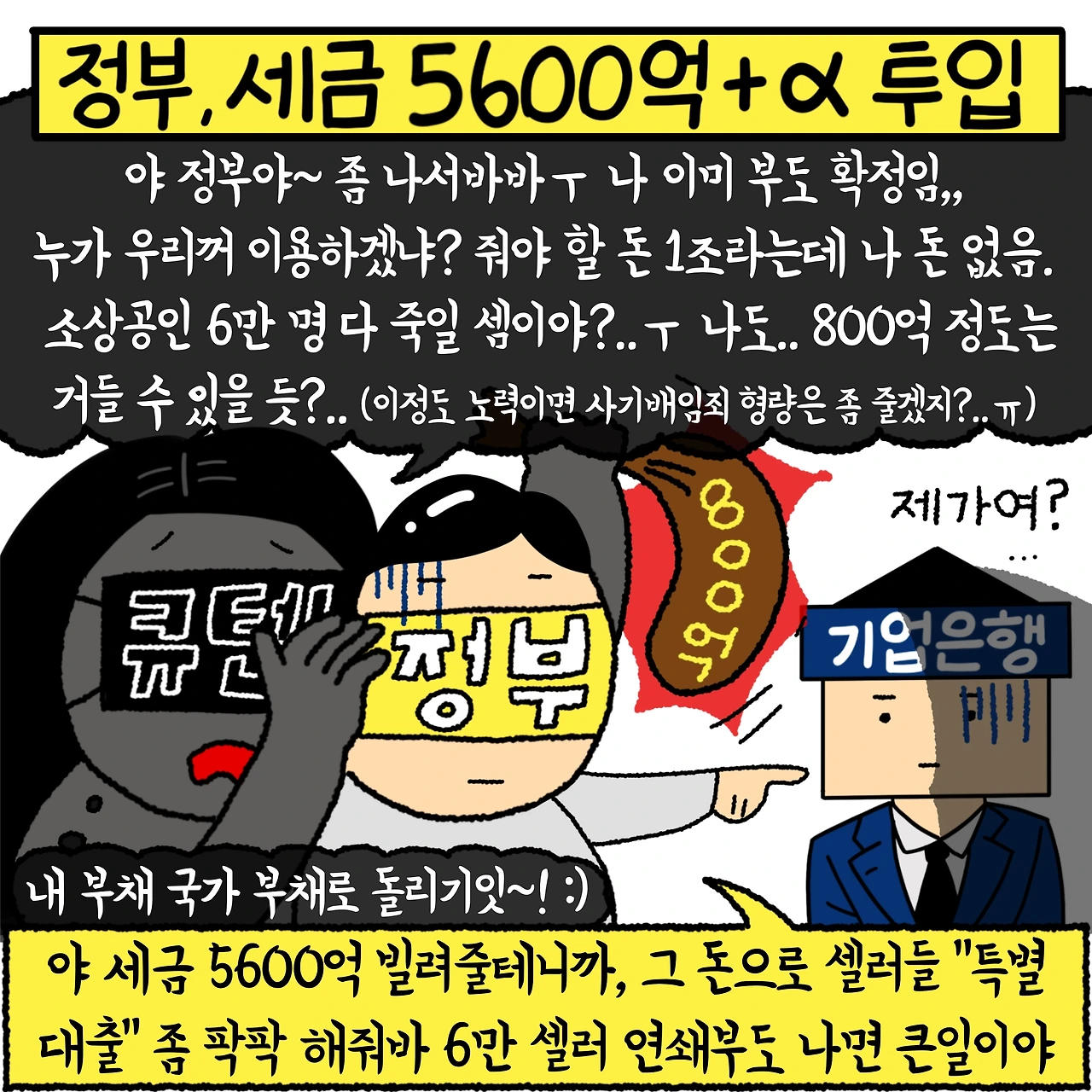 피해자들의 피해 규모가 너무 커서, 연쇄부도가 날 위기에 처했습니다. 정부는 급하게 국책은행(국가의 특정 정책을 수행하기 위한 목적으로 설립된 공적 은행)인 기업은행에 셀러들 “특별 대출”을 요청했습니다. 정부가 5600억을 은행에 예금하는 형식으로 지원해서, 그 돈으로 은행이 셀러들에게 대출을 해주는 것이죠. 분명 신용이 안 좋은 사람들도 있을 것이지만, 특수 목적으로 도와주라는 것입니다. 셀러들은 이 돈을 빌려서, ‘선정산’으로 돈을 빌렸던 다른 은행에 돈을 갚게 됩니다. 추후 대출 만기가 끝나면 기업은행은 사람들에게 돈을 다시 받아서 정부에게 5600억을 갚아야 합니다. 여기서 만약 셀러가 돈을 갚지 못한다면, 은행이 대신 셀러가 갚지 못한 돈을 갚아야 하는 것이죠. 정책 수행을 목적으로 만들어진 은행이기에 정책을 따를 수밖에 없습니다.
