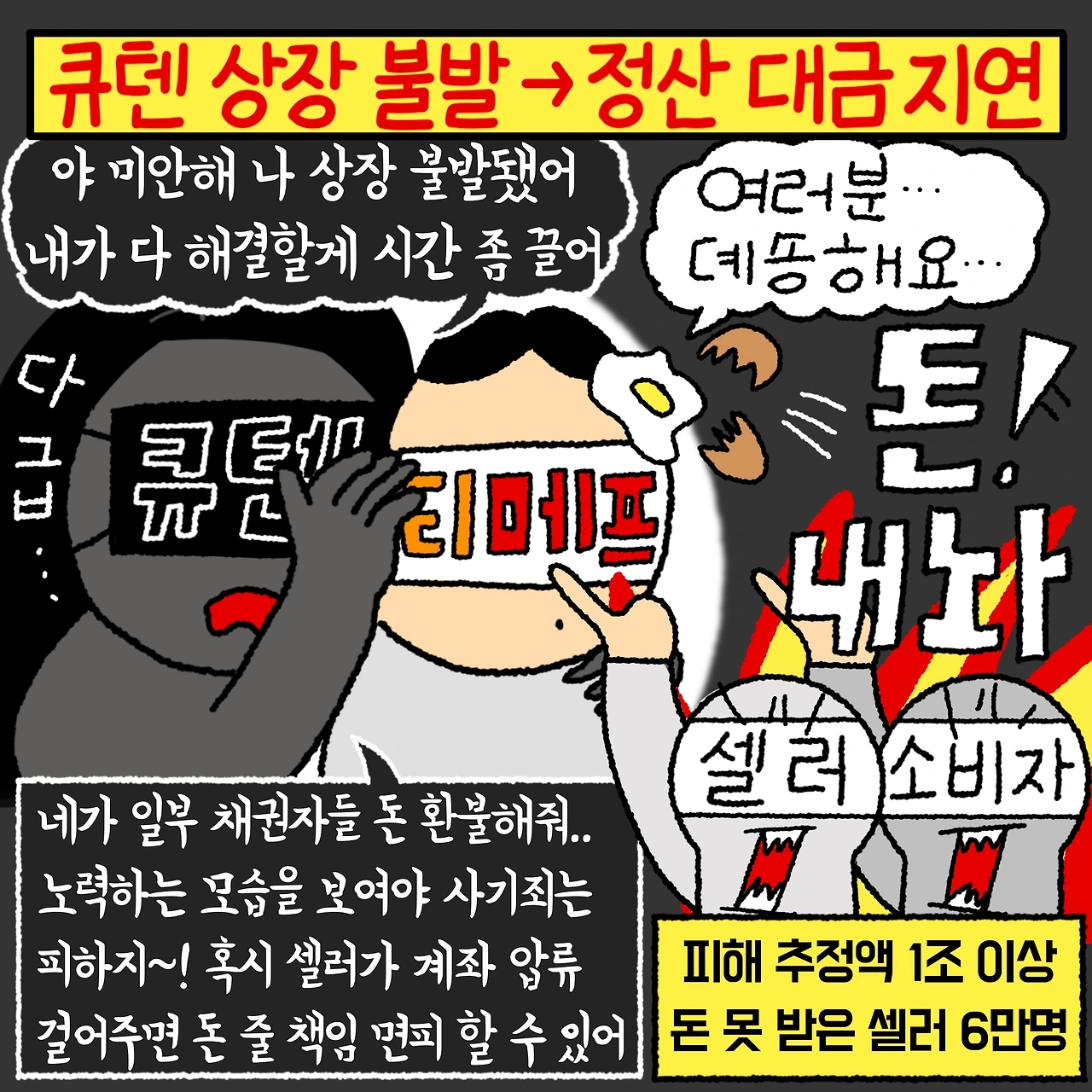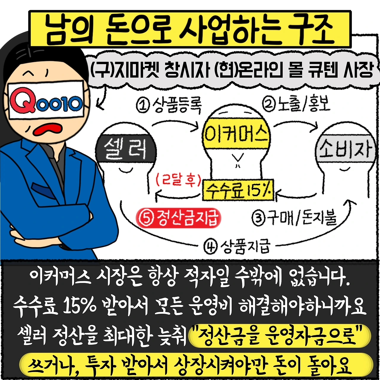 그렇게 돈을 끌어 모으며 무리하게 진행했던 큐텐 나스닥 상장은 결국 불발되었고, 모든 피해가 고스란히 셀러와 소비자에게 전가되었습니다.