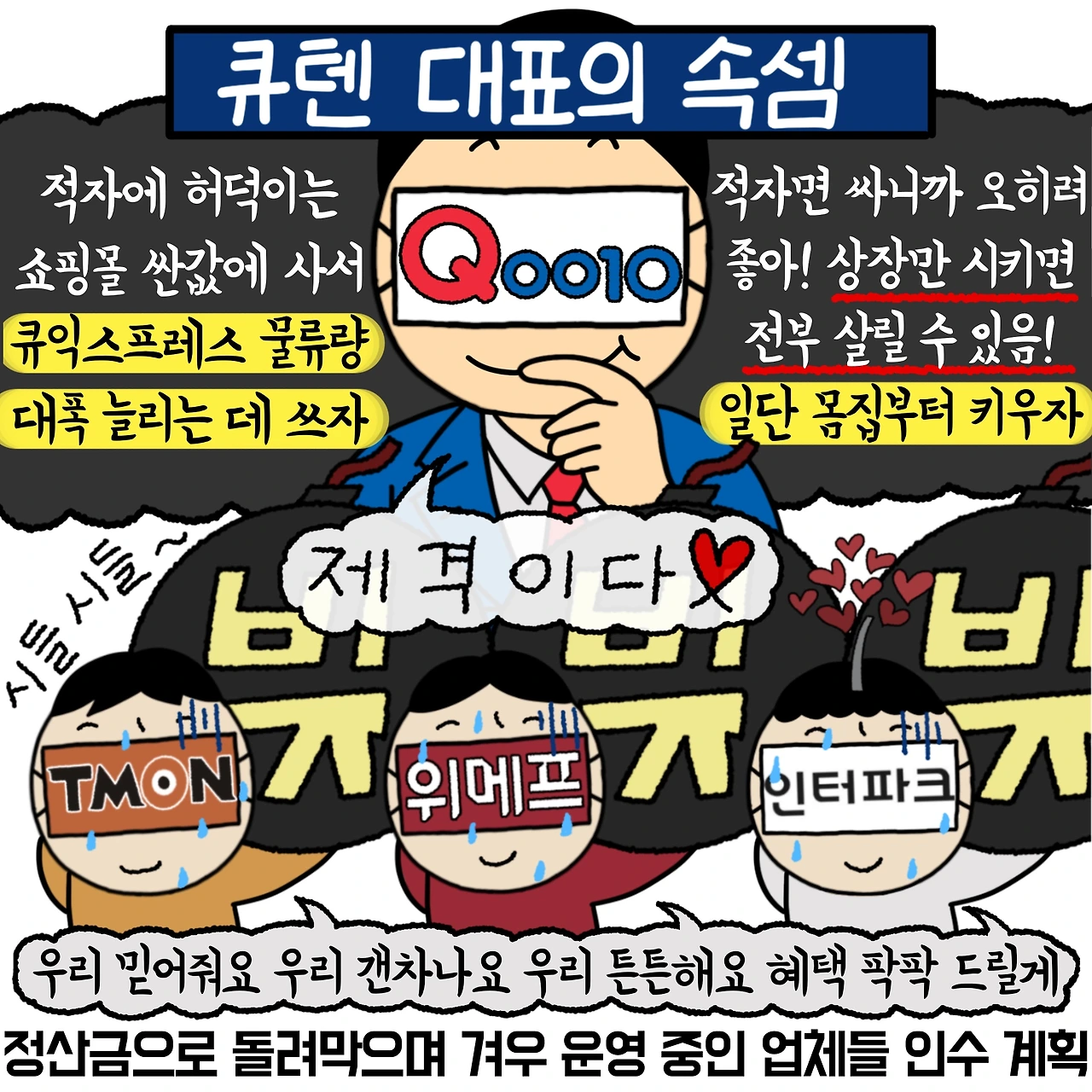 이미 자본잠식 상태였던 티메프는 새로운 투자자인 큐텐에 지분 교환 방식으로 회사를 넘겼습니다. 그럼으로써 티메프 최대주주는 티메프의 법적, 도덕적 책임에서 벗어나는 효과가 있었고, 큐텐은 돈 한 푼 안 들이고 티메프를 인수할 수 있었습니다.