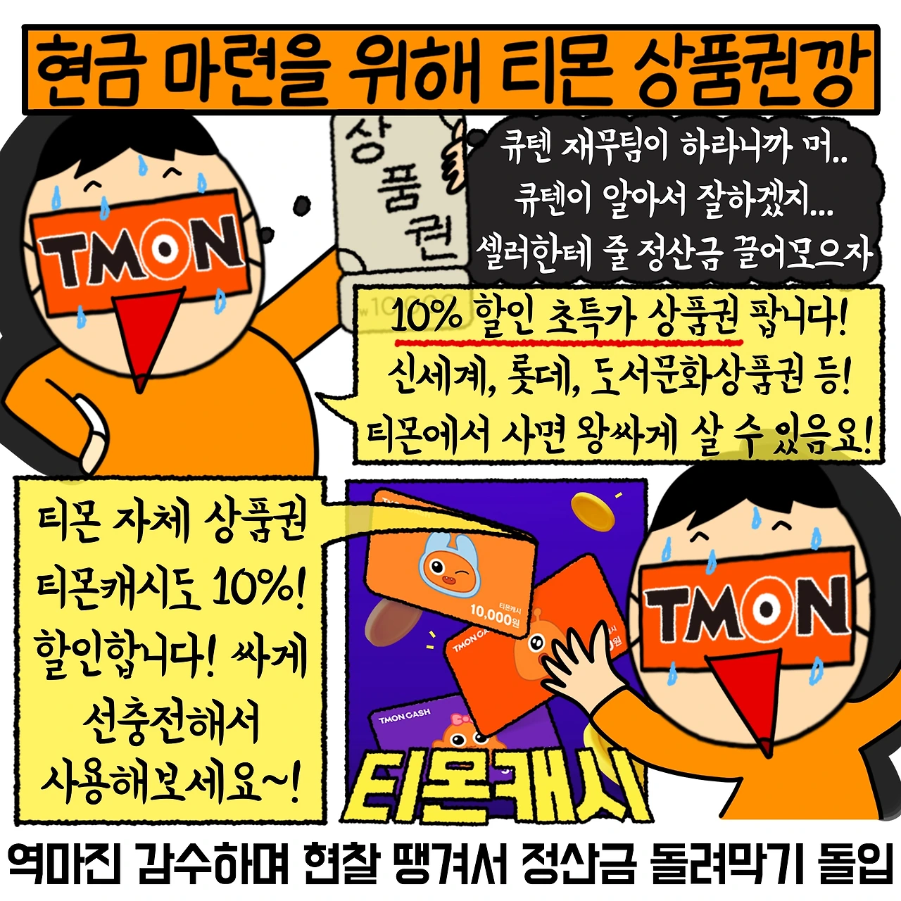 티메프의 모든 돈 관리는 큐텐 재무팀이 담당하고 있다고 말했죠? 큐텐 재무팀은 티몬의 현금 마련을 위해 “상품권 할인판매”를 지시하게 됩니다. 셀러들에게 정산해 줄 현금을 끌어모으기 위하여 상품권을 아주 싼 값에 무분별하게 발행하게 되는데요! “신세계, 롯데, 도서문화상품권 등”을 비롯해 티몬 자체 상품권인 “티몬캐시”도 10% 할인해서 판매를 진행하게 됩니다. 역마진을 감수하면서까지 큐텐이 상장하기 전까지 정산금 돌려 막기에 나선 것입니다.