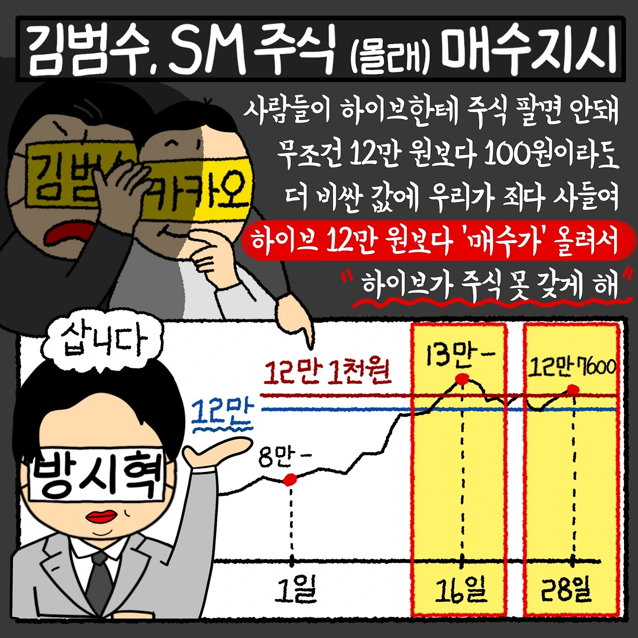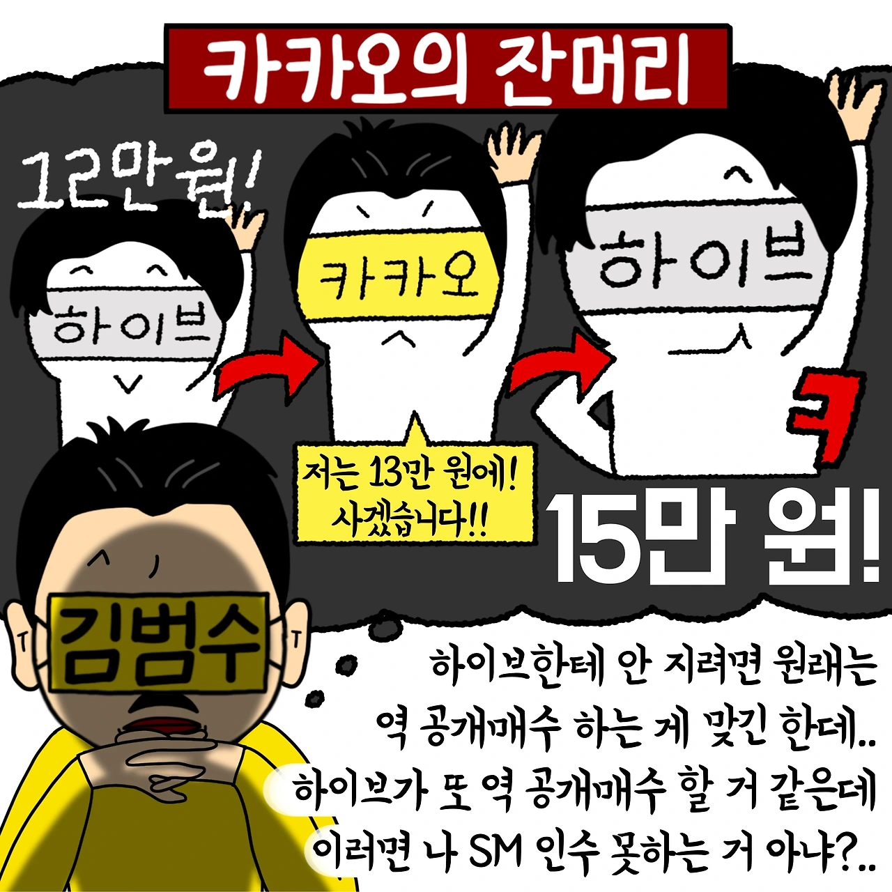 카카오의 생각을 아주 쉬운 말로 써보자면, “하이브가 12만 원에 산다고 하니까, 내가 뒤에서 12만 100원에 산다고 해야겠다! 그러면 아무도 하이브한테 주식을 안 팔고 나한테 팔겠지? 하이브 공개매수 기간 동안 기본 주식 거래 가격을 12만 원보다 무조건 높여서, 하이브가 SM 지분 못 가져가게 하자!! “라고 생각한 것이죠.