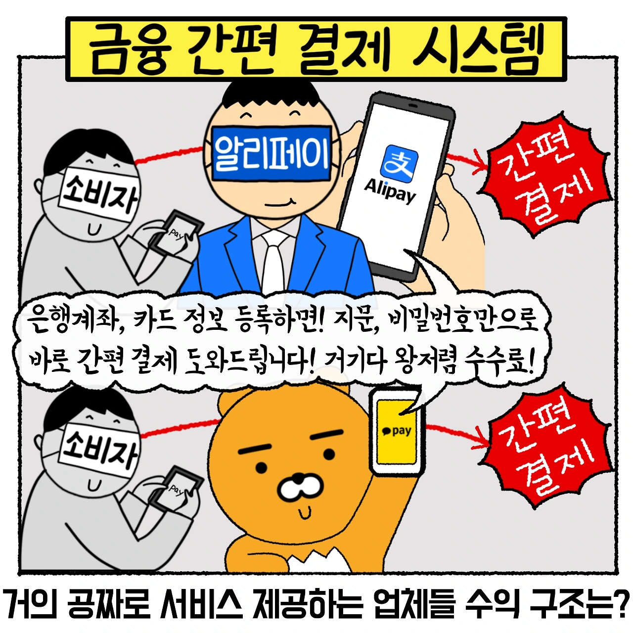 알리페이와 카카오페이가 제공하는 “금융 간편 결제 시스템”은, 지문 혹은 비밀번호만으로 빠르고 간편하게 송금과 결제를 도와주는 시스템입니다. 은행계좌, 카드 정보만 연결시켜 놓으면, 복잡한 결제 과정은 생략하고 저렴한 수수료로 빠르게 결제 가능하기 때문에 많은 분들이 애용하는 결제 시스템이 아닐까 생각합니다. 수수료가 거의 없다는 것이 소비자 입장에서 큰 장점인데요! 그렇다면 이 편리한 시스템을, 아주 저렴한 수수료로 제공하는 업체들은 돈을 어떻게 벌 까요?