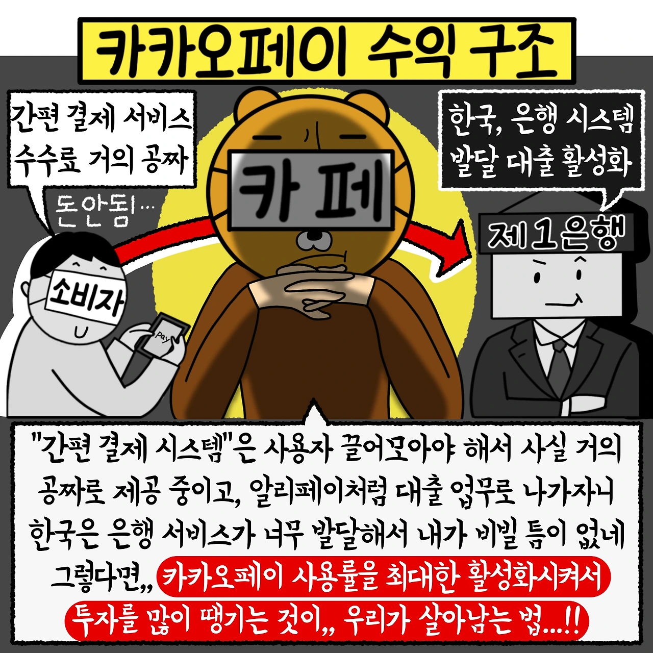 그렇다면 카카오페이의 수익 구조를 살펴볼까요? 우선 알리페이와 마찬가지로 저렴한 수수료로 사용자를 끌어모읍니다. 그러나 알리페이처럼 대출 업무로 진출하기엔, 한국의 은행 시스템이 워낙 발달해 있어서 카카오페이가 비비고 들어갈 틈이 없었죠. 그럼 어떻게 해야 할까요? 카카오페이는 투자를 최대한 땡기는 것을 목표로 하게 됩니다. 사용자를 끌어모으고, 카카오페이 사용률을 최대한 활성화시켜서 투자를 많이 받는 것이, 카카오페이의 가장 큰 수익 구조였죠!