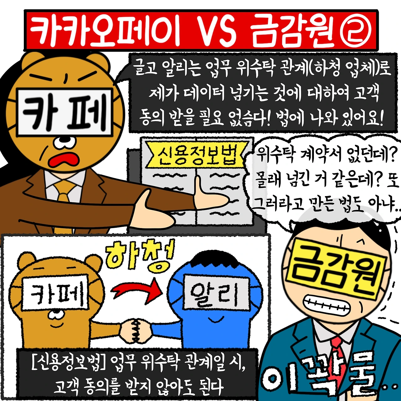 또한 카카오페이는 ”업무 위수탁 관계”, 즉 카페가 알리한테 ‘하청’을 준 것이기 때문에, 하청준 것까지 일일이 고객 동의를 받을 필요 없었다고 주장합니다. 신용정보법에 나와 있는 ‘업무위수탁 관계일 시 고객 동의를 받지 않아도 된다’는 법을 근거로 들었습니다.