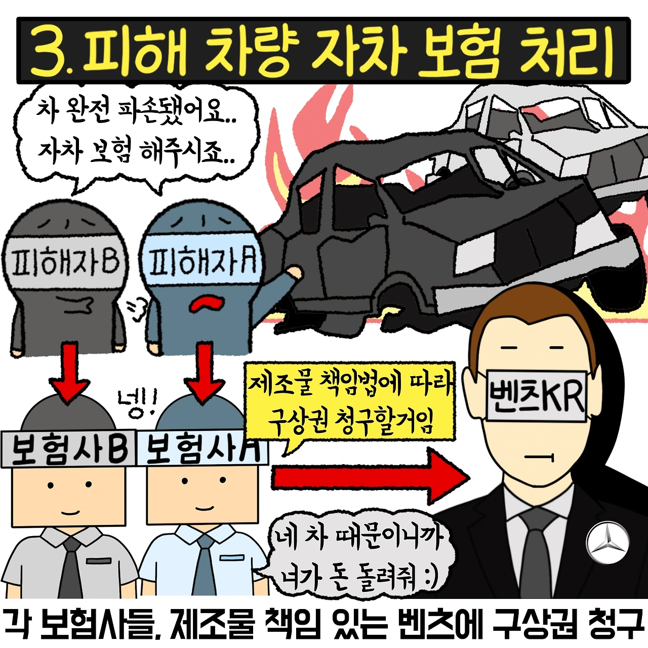 세 번째로 140여 대의 피해 차량들은 자차 보험 처리를 하게 됩니다. ‘아파트 화재보험’에 차량 화재 보상은 포함되어 있지 않았다고 해요. 피해자들은 각자가 가입한 보험사에 보험처리를 요청하게 됩니다. 각 보험사들은 피해자에게 보험처리를 해주고, ‘사고 원인 제공자’인 벤츠 코리아에게 “제조물 책임법”에 따라 구상권을 청구하게 됩니다. 쉽게 말하자면, ”네가 만든 차가 폭발했으니까 네가 돈 내놔“라고 한 것이죠. 그렇게 되면 결국 벤츠는 140여 대의 자동차 피해 보상을 해줘야 됩니다.