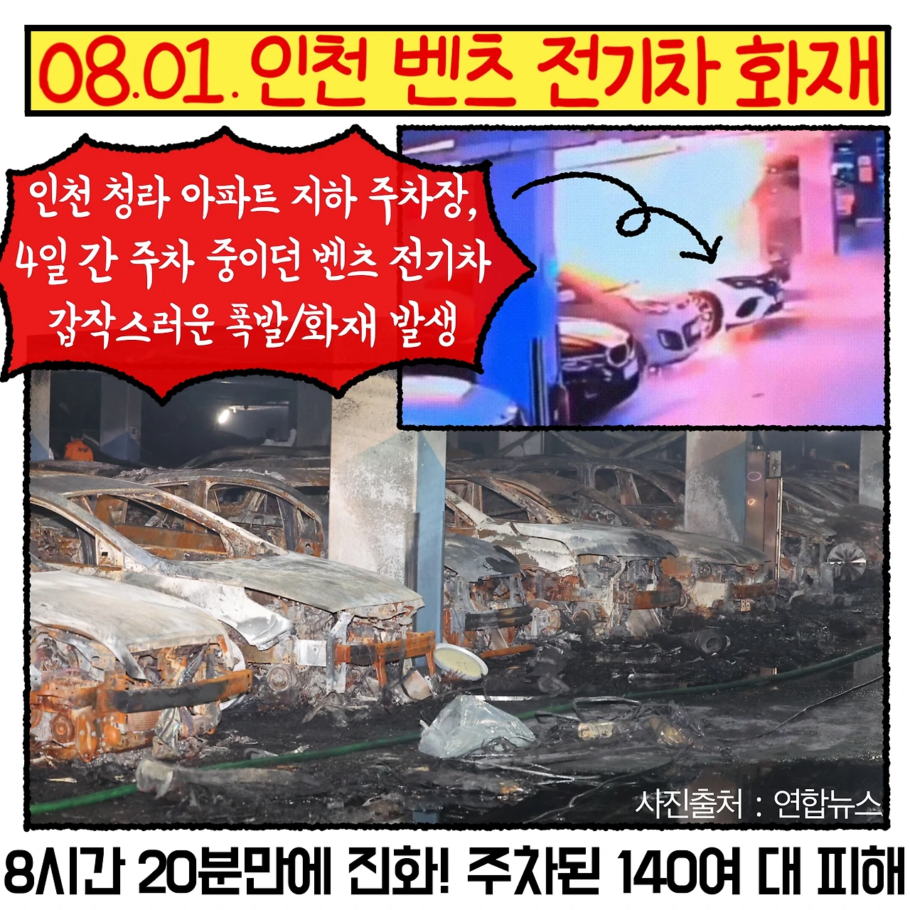 8월 1일 새벽 6시 즈음, 인천 청라아파트 지하주차장에서 4일 간 주차 중이던 벤츠 전기차가 갑작스럽게 폭발하였습니다. 화재는 삽시간에 번져 8시간 20분 만에 진화되었고, 주차장에 주차된 140여 대의 자동차가 피해를 입었습니다.
