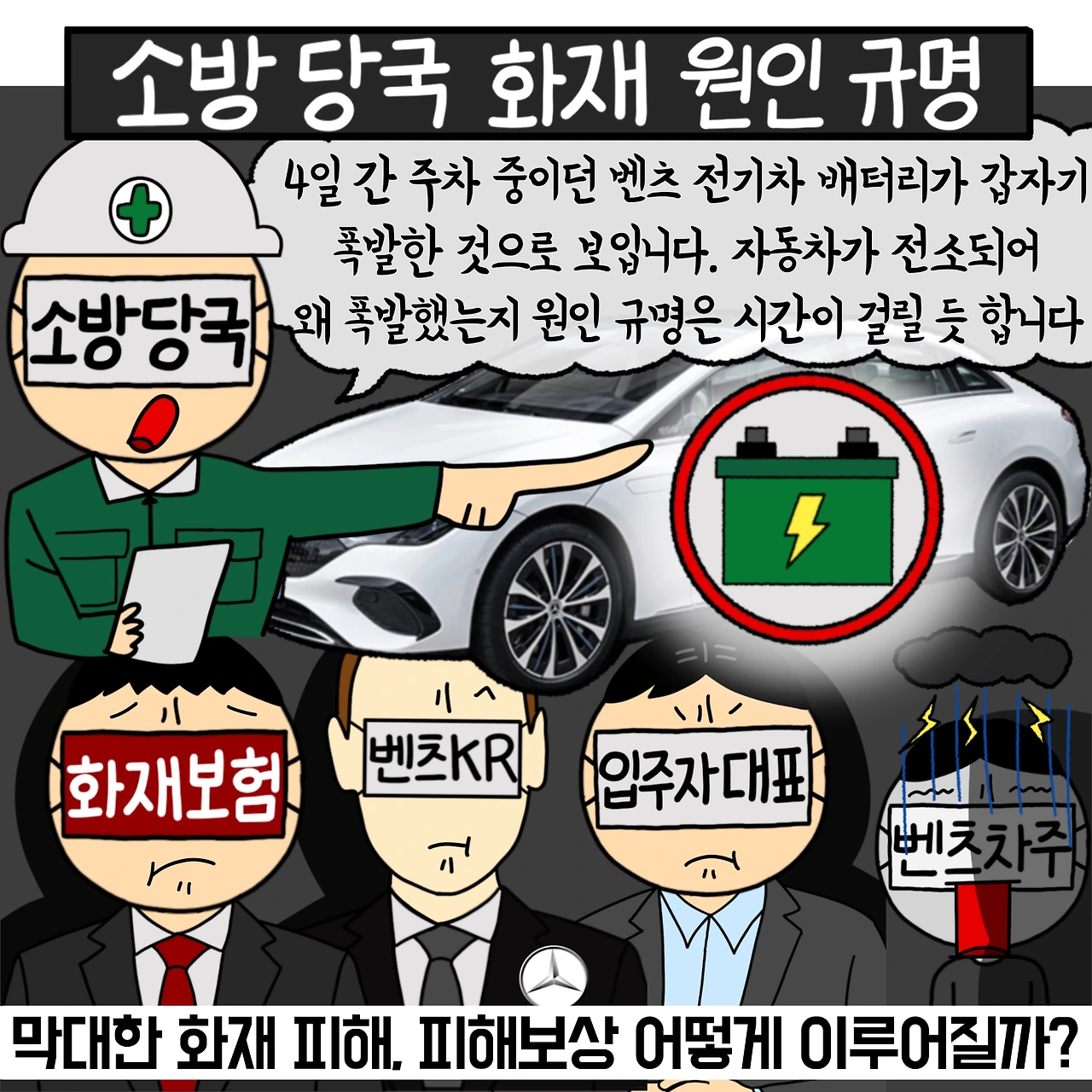소방당국은 “벤츠 EQE 전기 자동차의 배터리 폭발”을 화재의 원인으로 꼽았습니다. 자동차가 전소되어 배터리 폭발의 정확한 원인 규명에는 시간이 좀 걸릴 것으로 보입니다. 이번 원인 규명은, 화재 책임 분배를 위해 매우 중요한 사안입니다. 이 막대한 피해보상을 누가 하게 될까요?