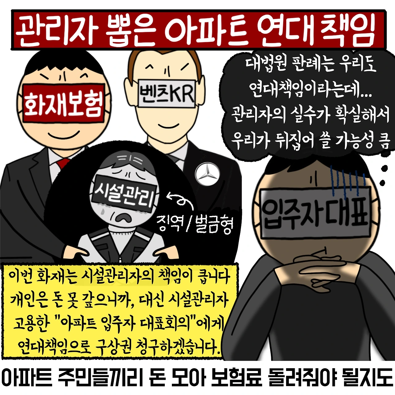 이번 화재가 대형화재로 번진 것은 ‘시설관리자‘의 책임이므로 벤츠와 화재보험사는 ’ 시설관리 회사’에 구상권을 청구할 수 있습니다. 그러나 막대한 피해 보상을 해주기엔 회사 규모가 너무 작기에, “시설관리자를 고용한 아파트 입주자 대표회의”에게 연대책임으로 대신 구상권을 청구할 것으로 보입니다. 대법원 판례에도 연대책임을 인정하고 있기에, 아파트 입주자들끼리 돈을 모아서 받은 보험료를 도로 돌려줘야 될 수도 있습니다. 과실 비율을 놓고 긴 법정 다툼이 예상됩니다.