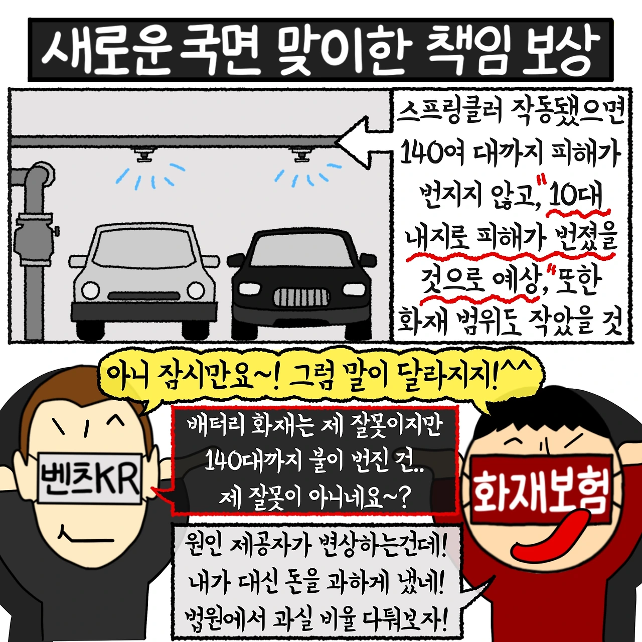 배터리 폭발은 벤츠의 잘못일 수 있으나, 140여 대까지 피해가 번진 것은 스프링클러 오작동이 원인인 것이죠. 또한 화재보험사 역시 스프링클러만 작동 됐다면 10대 내지의 피해만 복구해 주면 되는데, 스프링클러 미작동으로 인하여 아파트 내부 피해까지 전부 보상해 주게 되었으므로, 시설관리자에게 구상권을 청구할 수 있게 됩니다. 법원에서 과실 비율을 다퉈볼 수 있게 된 것이죠.