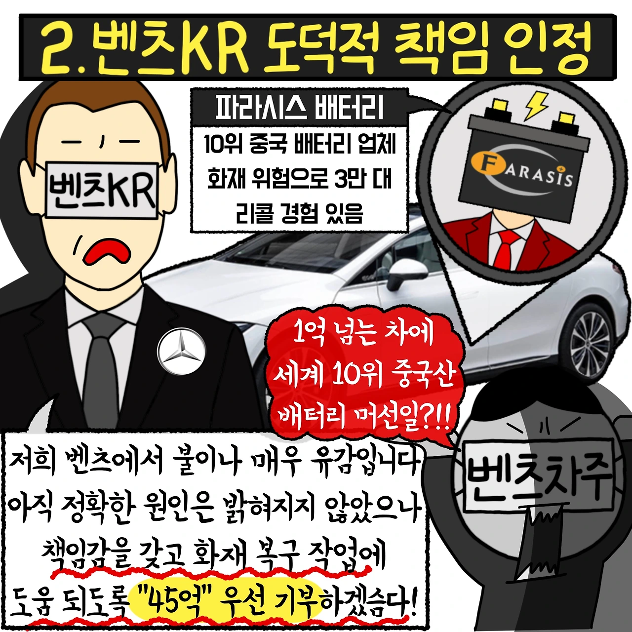 두 번째로 벤츠 코리아는 벤츠 차에서 발생한 화재의 도덕적 책임을 인정하며, 우선 45억 기부 의사를 밝혔습니다. 이번 화재 원인을 밝히는 과정에서 1억 넘는 벤츠 자동차에, 세계 10위 중국 파라시스 배터리를 넣은 것이 발각(?)되었는데요! 파라시스 배터리는 화재 위험으로 인하여 3만 대 리콜 경험이 있는 회사입니다. 사람들은 비싼 자동차에 값싼 배터리를 넣은 벤츠를 비난하였고, 벤츠는 책임을 인정하며 45억 기부를 하게 된 것이죠.