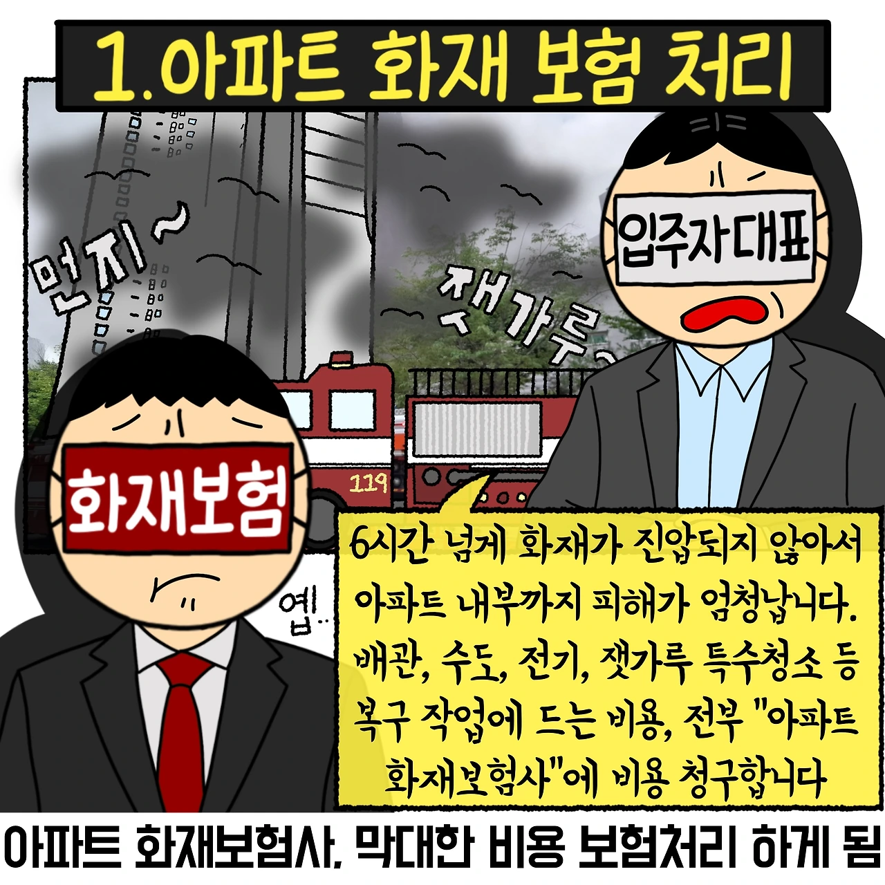 아파트는 혹시 모를 화재에 대비해 의무적으로 화재 보험에 가입하게 되어있습니다. 발생한 화재 피해에 대해서 아파트 화재 보험사가 전부 보상을 해줘야 하죠.