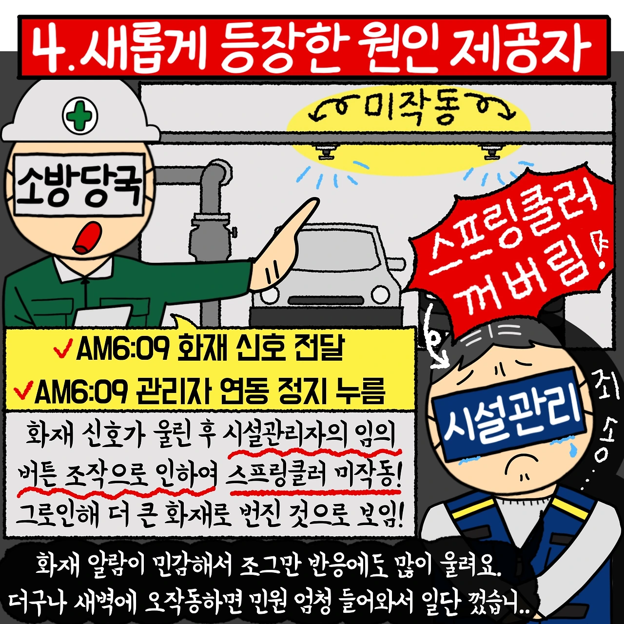 만약 스프링클러만 제대로 작동했다면, 140여 대가 아닌 10대 내지로 피해가 번졌을 것이며, 화재 범위도 훨씬 작았을 것으로 예상됩니다. 이렇게 되면 피해 보상의 책임은 새로운 국면을 맞게 됩니다.