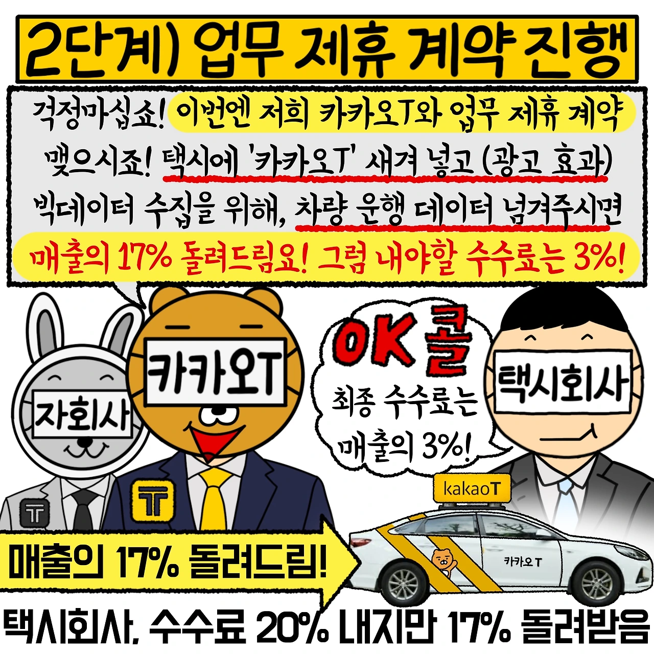 이번엔 자회사가 아닌 카카오T가 택시회사와 ‘업무 제휴 계약’을 맺게 됩니다. 택시에 ”카카오T"를 새겨 넣고, 추후 빅데이터 수집을 위해 차량 운행 데이터를 넘겨주면, 매출의 17%를 다시 돌려주겠다고 한 것이죠.