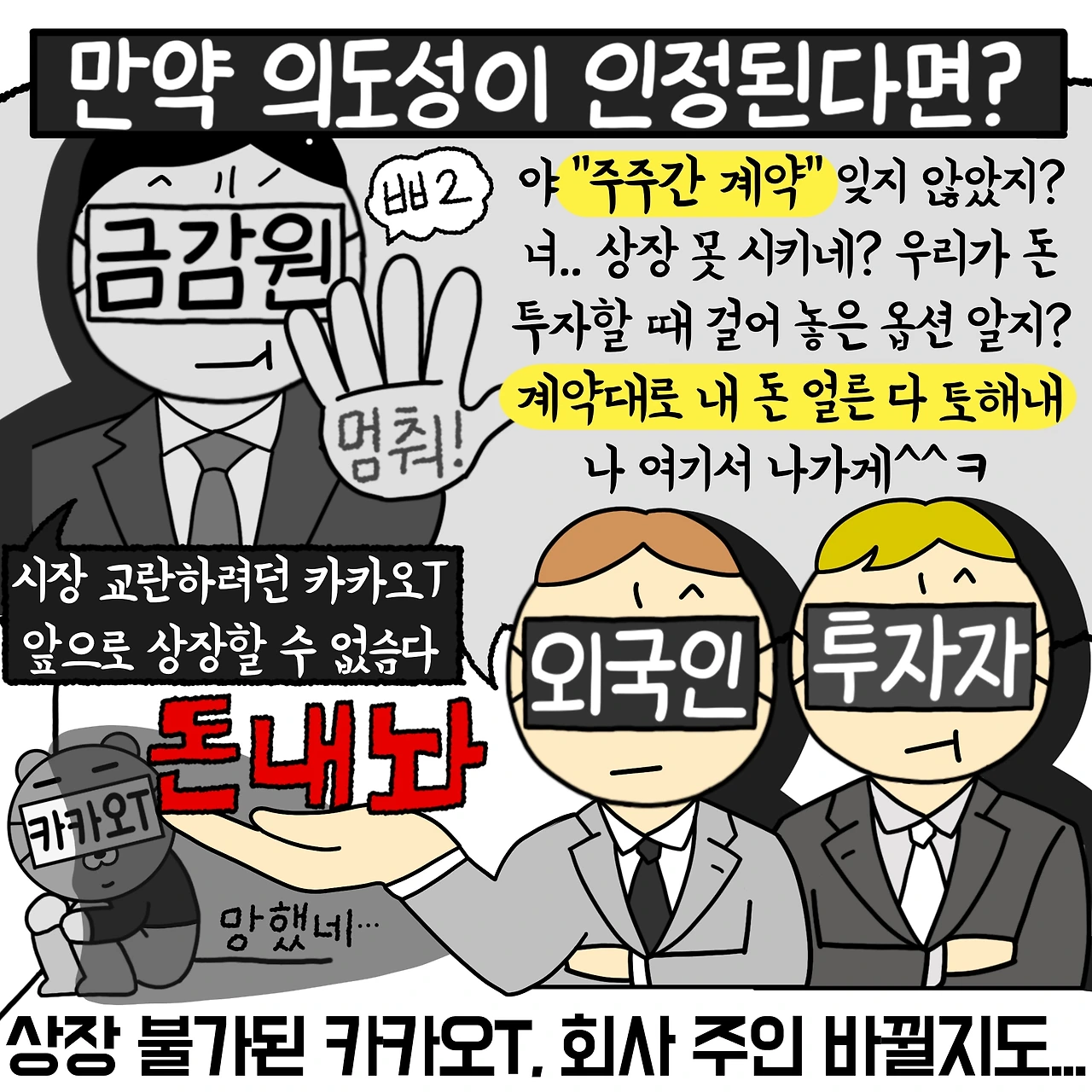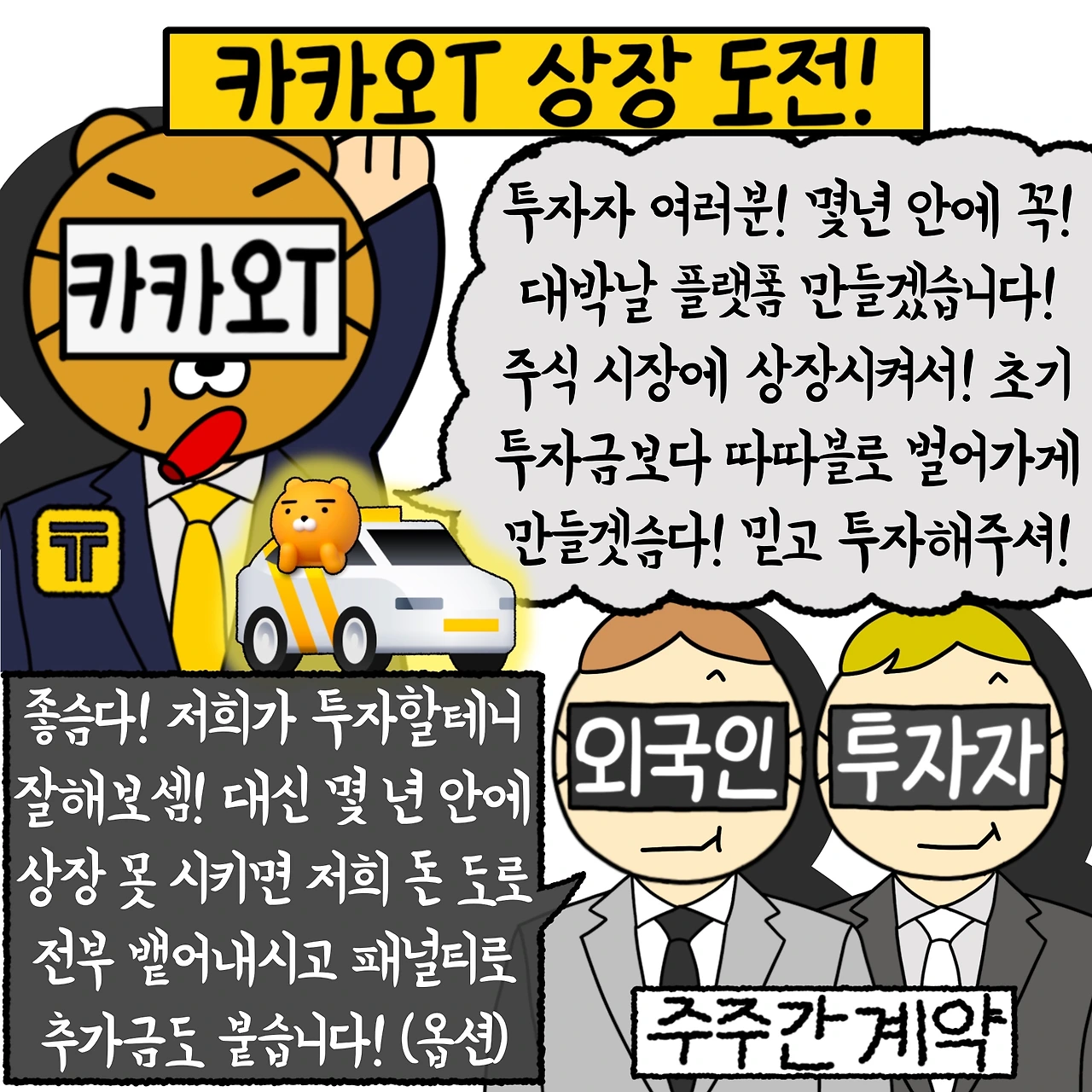 카카오T 역시 “추후 상장을 목표”로 외국 펀드 투자자들로부터 투자를 받게 됩니다. 단 아직 검증되지 않은 회사에 돈을 투자하는데, 그냥 투자하진 않겠죠? 투자자들은 추후에 돈을 못 받을 경우를 대비하여 갖가지 안전장치(옵션)를 걸어 놓습니다. 상세한 내용이 외부로 유출되진 않지만, 계약 내용을 상상해 보자면 ”5년 안에 상장 못 시킬 경우 투자금 전부 도로 뱉어내고, 상장 못 시킨 페널티로 추가금도 붙습니다“ 와 같은 ’옵션, 조건’이 걸린 계약이라고 할 수 있습니다. 이를 “주주 간 계약”이라고 합니다.