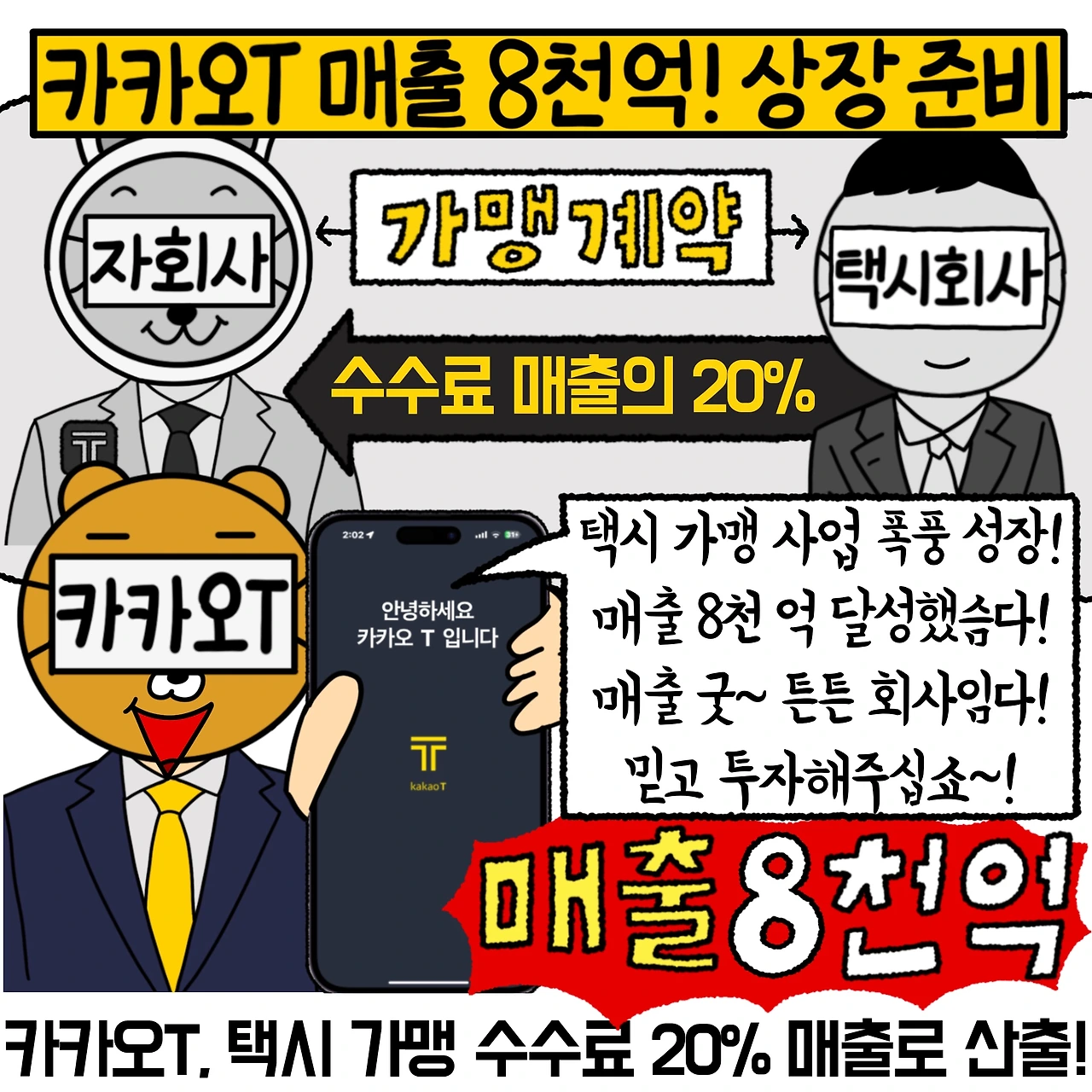 그렇게 카카오T는 택시 가맹 수수료 20%를 매출로 잡아, 매출 8천억을 달성하여 상장 준비를 하게 됩니다.