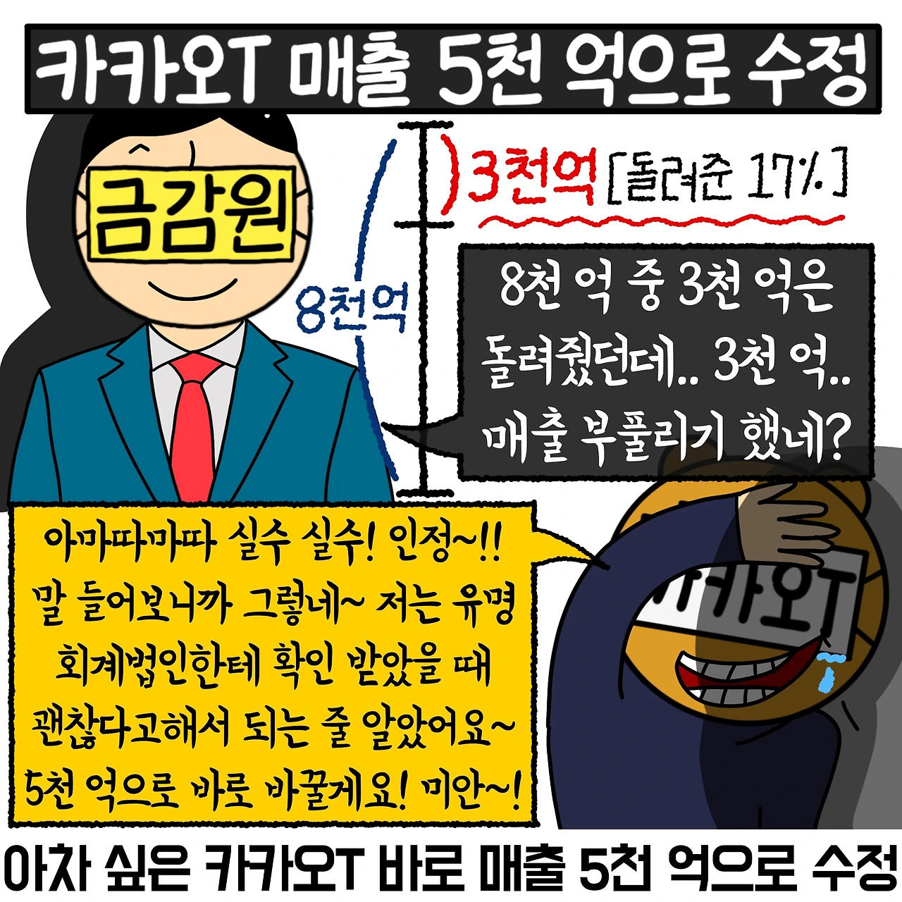 금감원은 카카오T에게 “가맹 수수료 20% 받은 걸 매출로 잡으면 안 되고, 추후에 돌려준 17%를 뺀 나머지 3%를 매출로 잡아야 한다"라고 말합니다. “가맹 수수료 20%만을 매출로 잡은 것”은 회계 조작이라고 주장합니다.