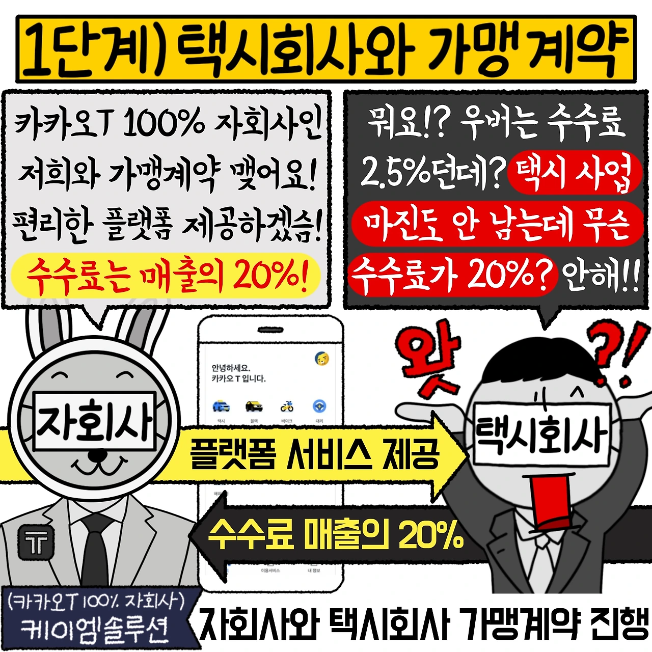 우선 카카오T의 100% 자회사인 ‘케이엠솔루션’과 택시 회사 간 가맹 계약을 맺게 됩니다. “택시 가맹 계약”을 맺게 되면, 카카오T는 손님과 택시를 연결시켜주는 플랫폼을 제공하고, 택시 회사는 카카오T에게 플랫폼 사용 수수료를 지급하게 되는데요! 카카오T는 “가맹 수수료를 택시 회사 매출의 20%”로 책정하였습니다.