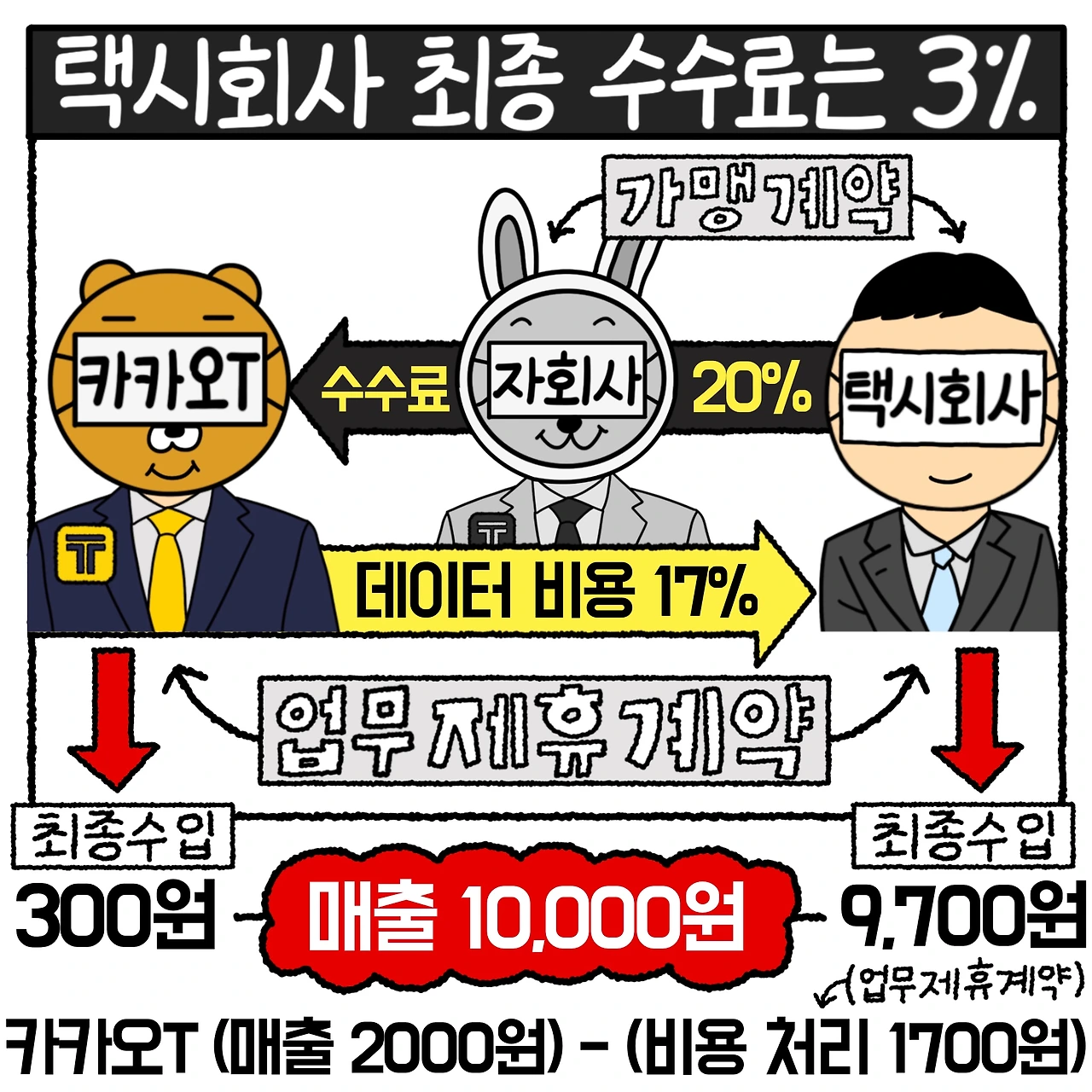 즉 택시 회사는 (카카오T 자회사에게 택시 가맹 수수료 20%를 지급한 후), (카카오T에게 데이터 제공 비용 17%를 돌려받게 되어), 택시 회사가 카카오T에게 지급한 최종 수수료는 매출의 3%가 되는 것 입니다.