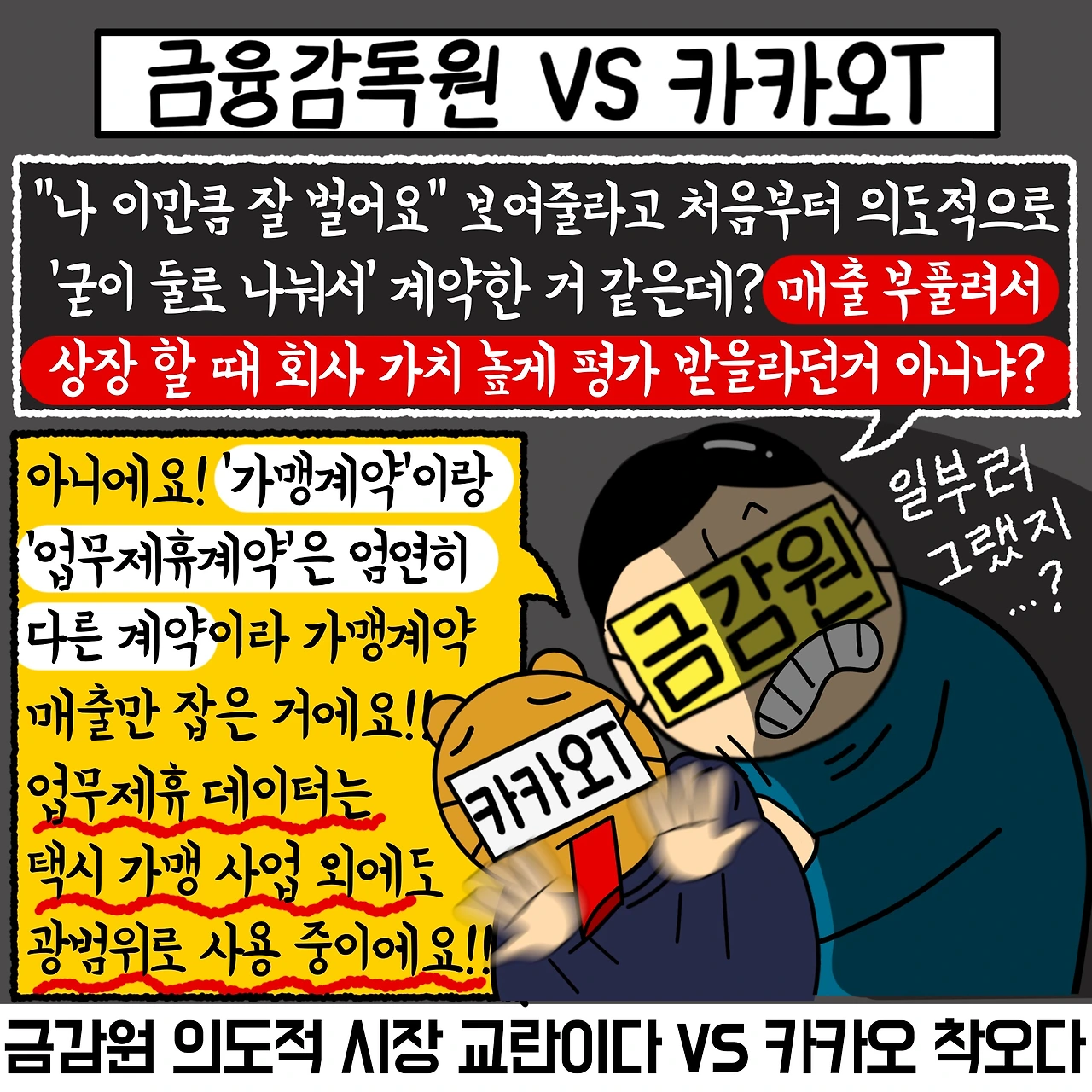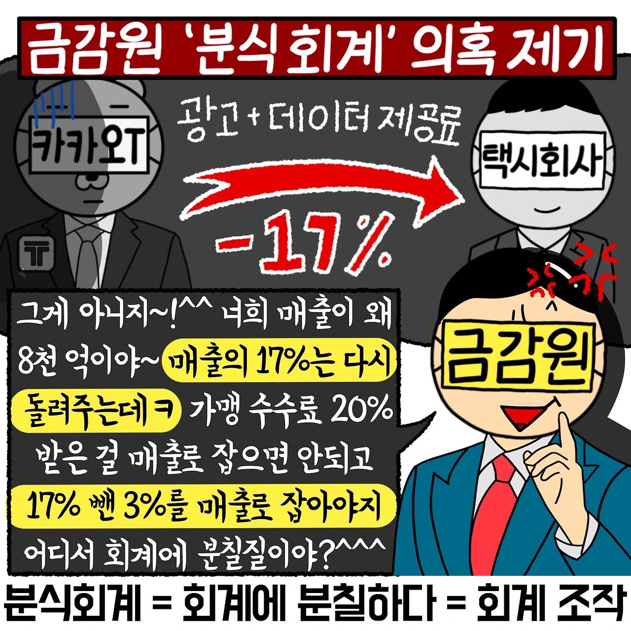 여기서 문제가 발생하게 됩니다. 금감원은 카카오T에게 “분식회계” 의혹을 제기합니다. 분식회계란 ‘회계에 분칠했다’는 의미로, 회계 조작을 의미합니다.