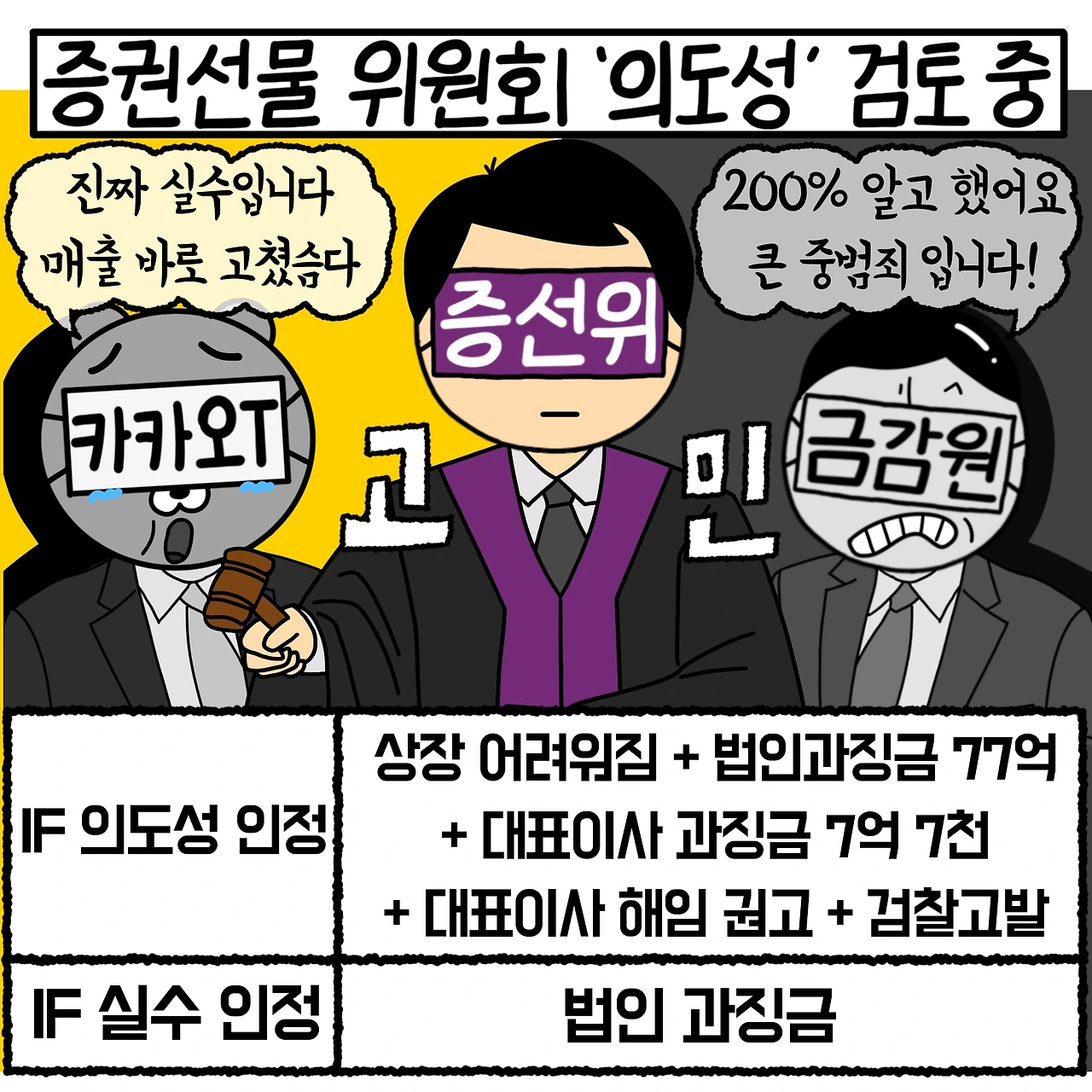 본 사안은 ‘증권선물거래위원회’로 넘어갔고, 증선위는 카카오T가 금감원의 주장대로 ”의도성을 갖고 매출 부풀리기를 한 것인지“, 카카오T의 주장대로 ”의도치 않게 시행한 것인지“를 판명 중입니다. 아직 결과가 나오진 않았습니다만, 만약 ’카카오T의 매출 부풀리기 의도성‘이 인정된다면, 카카오T는 강력한 제재를 받을 것으로 예상됩니다.