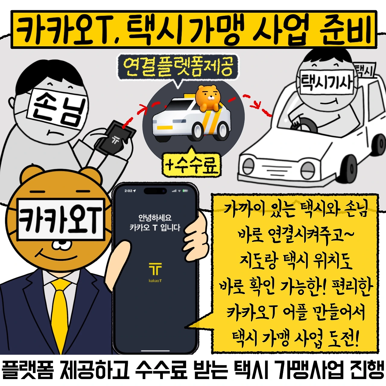 카카오모빌리티는 택시와 손님 사이에 플랫폼을 제공하고, 수수료를 받는 “택시 가맹 사업”을 추진했습니다. 전화를 통해 택시를 부르는 것이 아니라, 어플을 통해 간편하게 택시와 손님을 연결시켜주는 플랫폼 사업을 진행하게 된 것이죠.