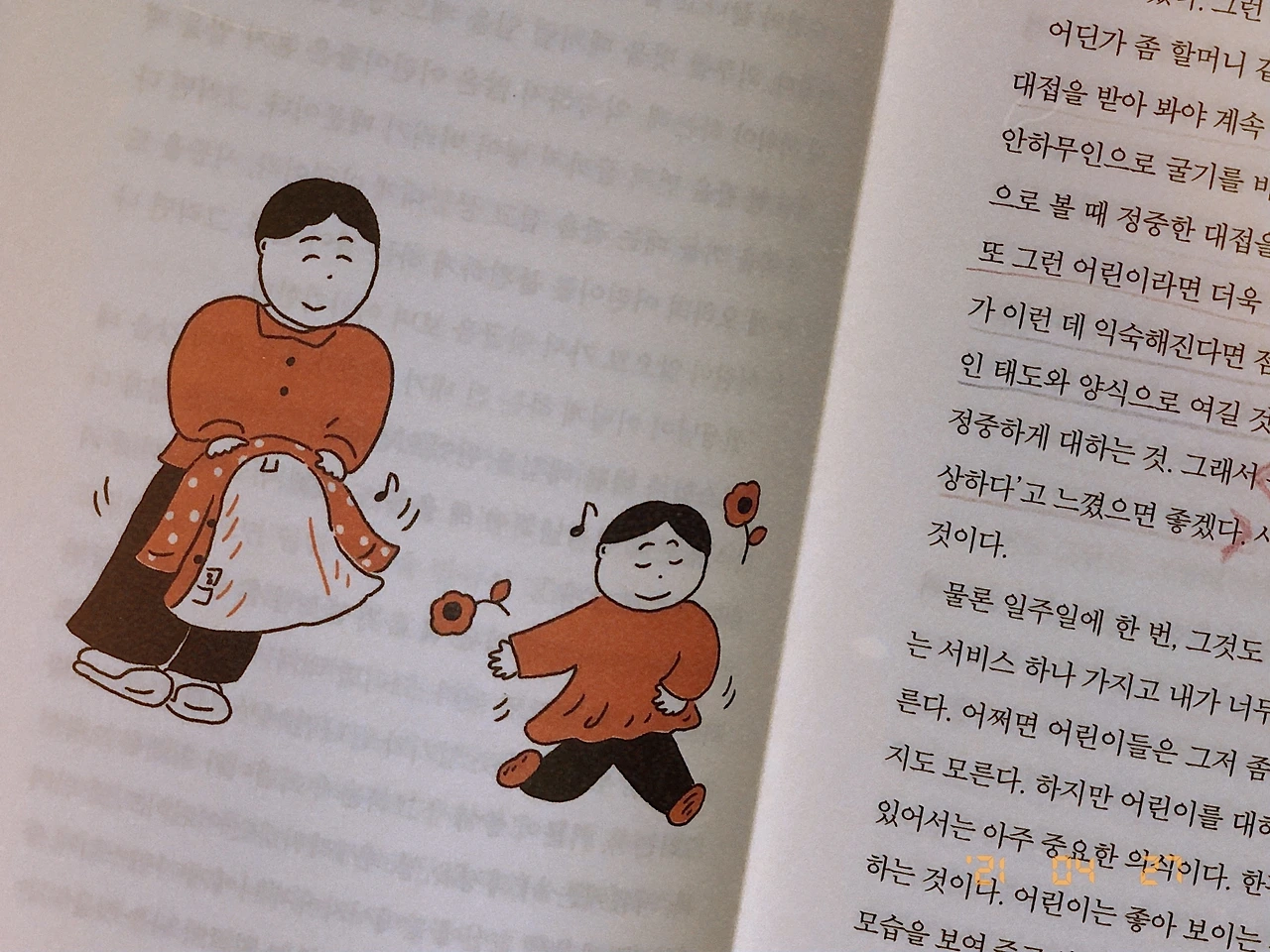 벌써 16년이나 지났지만, 잊히지 않는 얼굴이 있다. 초등학교 4학년, 내가 참 좋아하고 따랐던 담임 선생님의 온화한 얼굴. 그때 왜 그렇게 좋아했는지 자세히 기억나지는 않지만, 유달리 겁도 많고 소심했던 나를, 따뜻한 미소로 안심시키던 선생님의 모습만은 선명하게 기억난다. 어린 나의 엉뚱하고 쓸데없는 질문에 귀찮아하실 법도 한데, 선생님은 언제나 정성껏 답 해주셨다. 고개 숙여 나와 눈높이를 맞춰주던 선생님 특유의 포근함이 좋아, 아직까지 나의 가슴 한편에 자리 잡고 있다. 책을 읽으며 과거 선생님의 얼굴이 계속 떠오른 이유는, 아마도 존중으로 어린이들을 대하는 저자의 모습에서 선생님의 모습이 오버랩됐기 때문이겠지.