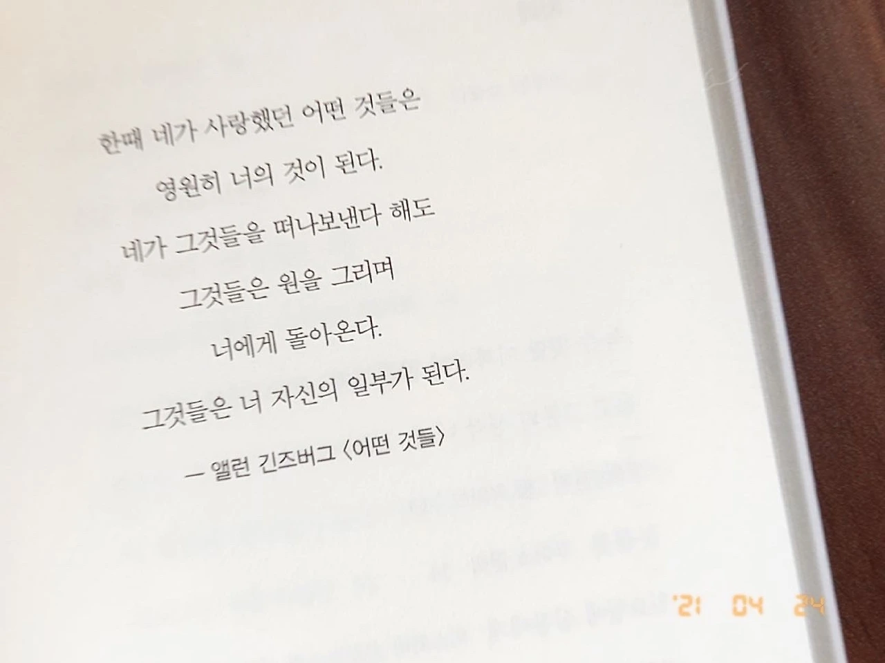 보이지 않는 먼 미래만을 바라보다, 정작 무언가에 열심히 취해 있는 나를 바라보지 못했다. 언제나 나는 부족했고, 스스로를 칭찬하지 못했다. 정처 없이 흐르는 시간에 휘말려 그만 방향키를 놓쳐버렸고, 걷잡을 수 없는 무기력한 마음이 나를 잠식한다. 나는 마음 챙김의 삶을 살고 있는가? 마음 놓침의 시간을 보내고 있는가? 어쩌면 또다시 찾아온 나의 방황은, 현재를 살고 있지 못하는 나에게, 시간의 압박에서 벗어나 잠시 쉼이 필요한 순간이라는 걸 알려주는 것일지도 모른다. 그리하여 나의 방황은, 평소라면 눈길 주지 않았을 시집을 덜컥 집어 들게 만든다. 나를 위로해 줄, 나를 쉬게 해 줄 누군가의 따뜻한 말 한마디가 필요했다.