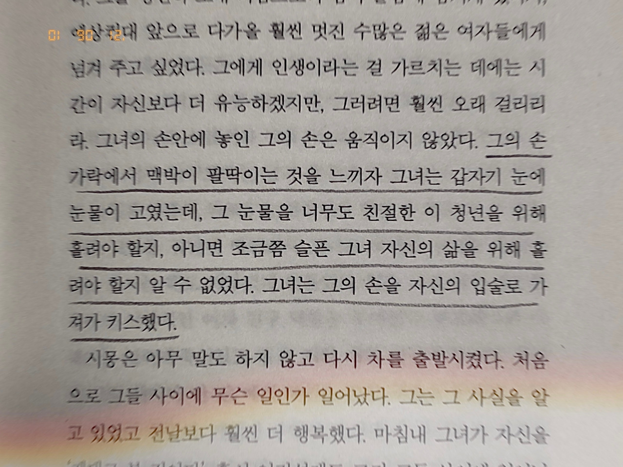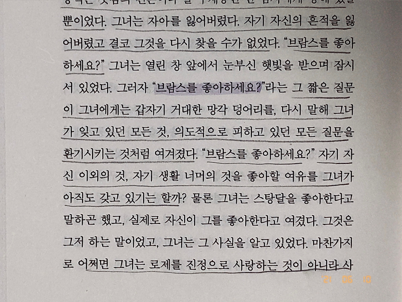 "브람스를 좋아하세요?" 그 짧은 질문이 그녀에게는 갑자기 거대한 망각 덩어리를, 다시 말해 그녀가 잊고 있던 모든 것, 의도적으로 피하고 있던 모든 질문을 환기시키는 것처럼 여겨졌다. '브람스를 좋아하세요?' 자기 자신 이외의 것, 자기 생활 너머의 것을 좋아할 여유를 그녀가 아직도 갖고 있기는 할까?