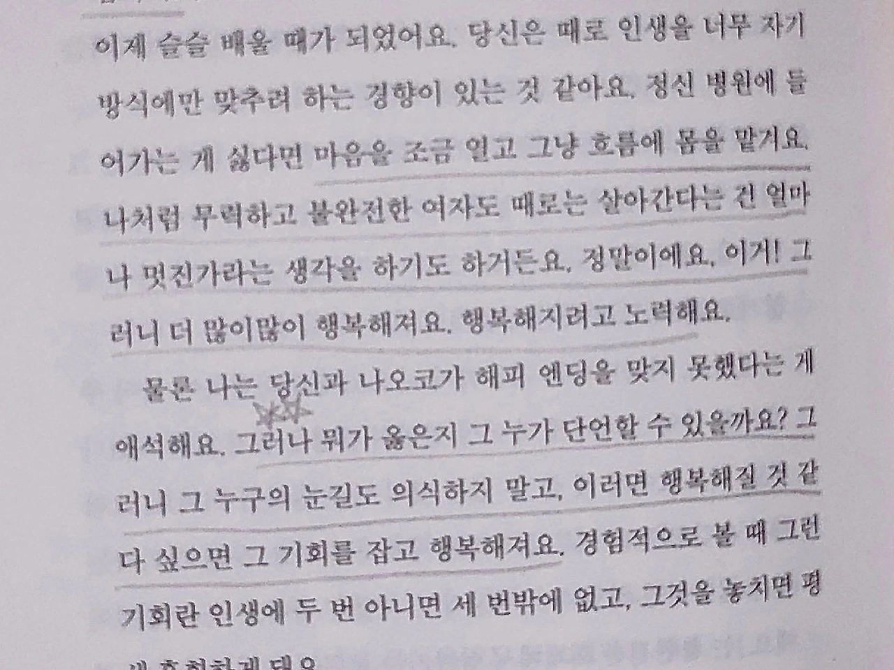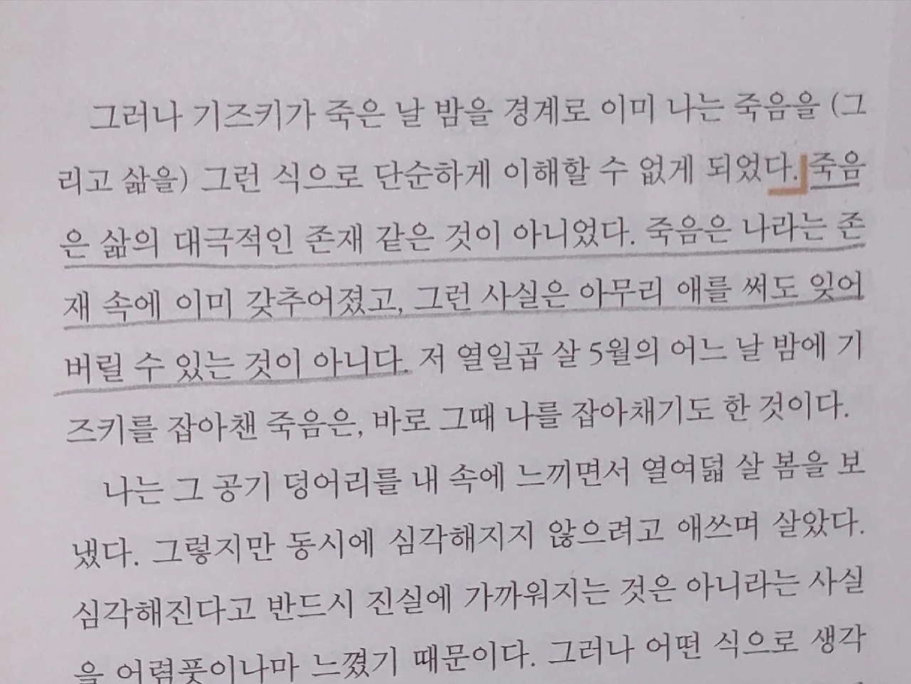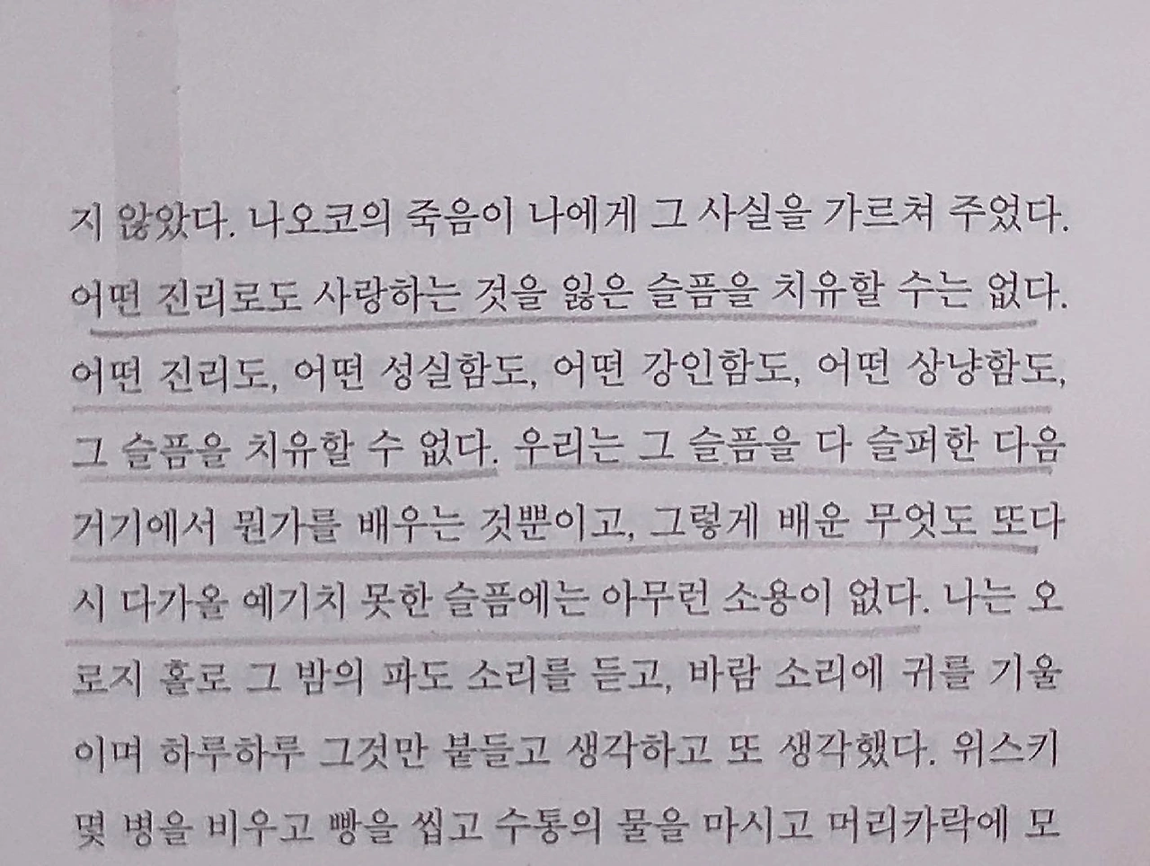 작가는 말한다. "어떤 진리도, 어떤 성실함도, 어떤 강인함도, 어떤 상냥함도 그 슬픔을 치유할 수 없다. 우리는 그 슬픔을 다 슬퍼한 다음 거기에서 뭔가를 배우는 것뿐이고, 그렇게 배운 무엇도 또다시 다가올 예기치 못한 슬픔에는 아무런 소용이 없다." 그저 맞닥뜨린 감정에 최선을 다해 슬퍼하고, 남은 자들과 그 아픔을 함께 공유하고 추억하며 끊임없이 마음의 굳은 살을 만들어가는 거다. 그렇게 '상실의 시대'를 견디어 내는 것이다. 상실의 아픔으로부터의 배움이 다음에 다가올 슬픔에 아무런 쓸모가 없다고 하더라도, 그 굳은 살은 넘어져도 다시 일어날 수 있는 원동력이 되어줄 것이다. 그렇게 살아가는 거다.