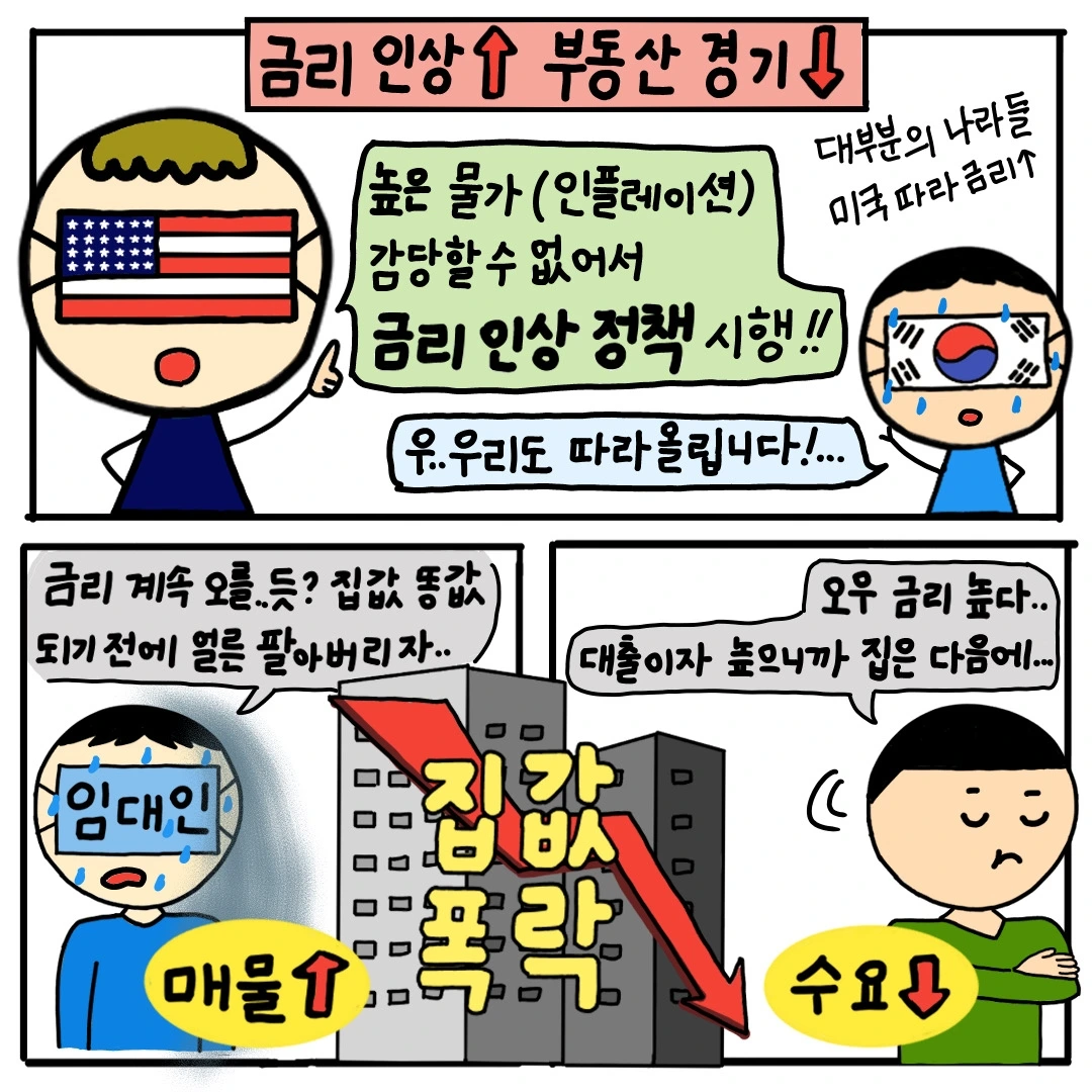 금리가 점점 높아지면서 눈치 빠른 임대인들은 재빨리 집을 팔아서 매물이 늘어갔지만 부동산 수요가 점점 줄어들면서 집값은 폭락하게 됩니다. 그렇게 22년 9월부터 부동산은 순식간에 불황의 길로 접어 됩니다.