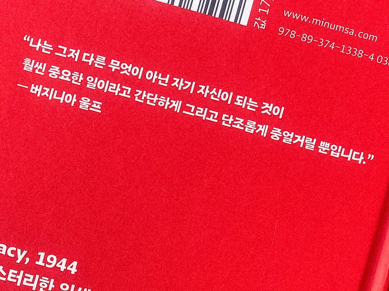 여성은 단지 남성의 부속품 정도로 밖에 여겨지지 않는 것을 보며, ‘그때 그 시절엔 어쩔 수 없었겠지’, 생각하며 애써 모른 척 넘어갔다. 그렇게 못 본 척 지나쳤던 그녀들의 존재를, 나는 버지니아 울프의 사려 깊은 말들을 통해 처음으로 만날 수 있었다. 울프는 인정받지 못하고 남자의 그림자 속에 가려 익명을 강요받던 여성들을 세상 밖으로 등장시켜, 오랜 세월 그녀들을 가리고 있던 검은 그늘을 걷어 올린다.