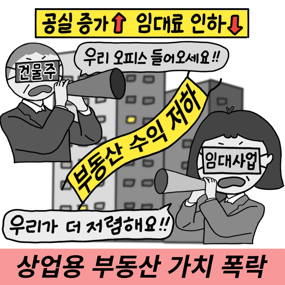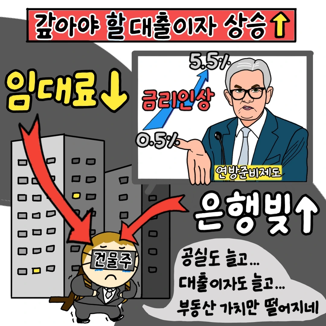 빈 사무실이 늘어나자 부동산 업자들의 고민이 시작됩니다. 사무실 수요가 급격히 낮아져서, 임대료를 대폭 인하하기 시작합니다. 그러다 보니 공실은 계속 늘고, 임대료는 내려가고, 수익은 저조하고, 상업용 부동산 가치가 폭락하게 됩니다.
