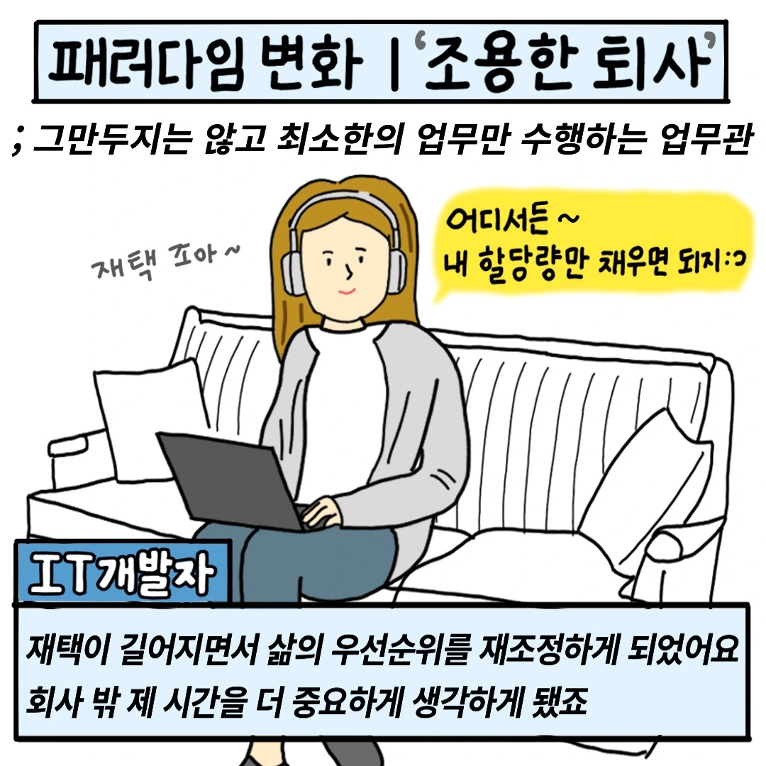 이 말이 유행하게 된 데에는 코로나의 영향도 컸는데요! 코로나 시절, 많은 기업들이 어려움에 처하자 구조조정을 하게 되었다고 해요. 많은 근무자들이 퇴사를 하게 되면서 "회사에 그렇게까지 열정을 쏟아붓지 말자"는 의식이 생겼다고 합니다. 또한, 재택근무를 해보니, 정해진 일만 효율적으로 끝내 놓으면 자신만의 시간을 확보할 수 있었고, 그럼으로써 근무자들이 삶의 우선순위를 재조정하게 되었다고 합니다. 이러한 근무 패러다임의 변화는 근무자들의 회사 복귀를 늦추었고, 아직도 많은 이들이 계속 원격근무를 하고 싶다고 말하는 이유 중 하나입니다.