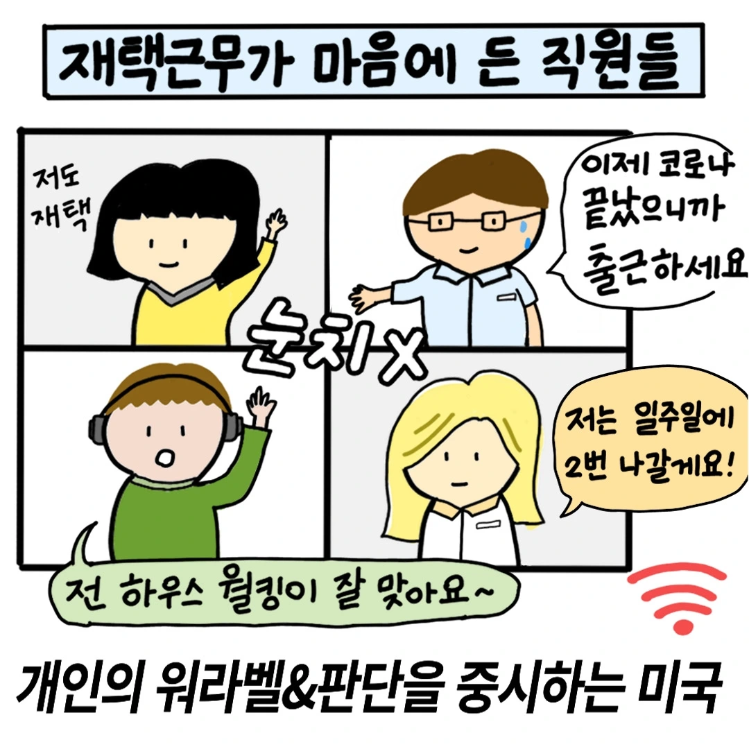 코로나가 끝나자마자 우리나라 근무자들은 대부분 재택을 끝내고 회사로 돌아갔습니다. 우리나라는 공동생활을 중시하고 재택을 하고 싶어도 상사의 눈치를 살펴야할잖.. 아요? 헣ㅎ.. 위에서 나오라고 하면 나가야죠..