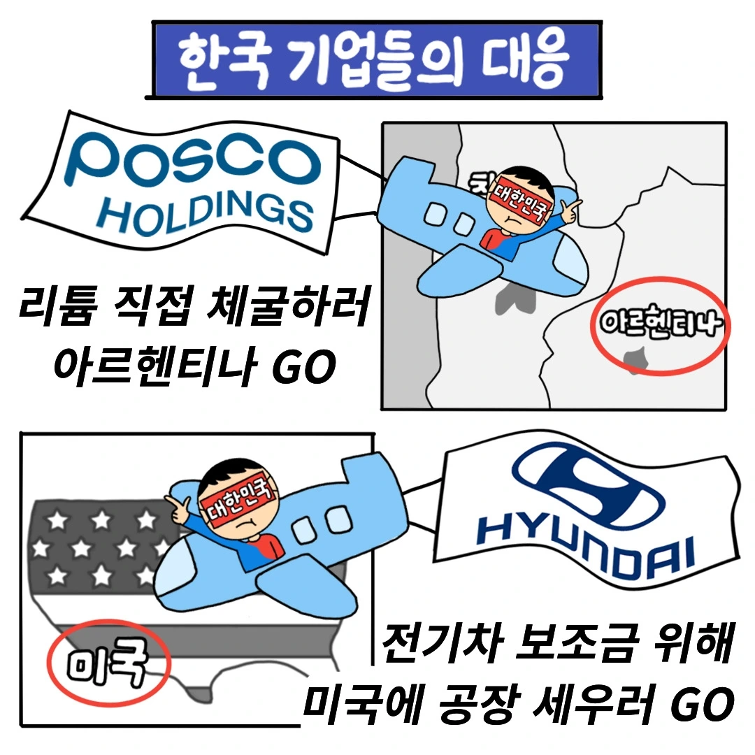 이에 한국 기업들도 발 빠르게 움직였습니다. 우선 포스코 홀딩스는 리튬을 직접 채굴하기 위해 아르헨티나와 협력관계를 맺었고, 현대 자동차는 미국 전기차 보조금을 받기 위해 미국에 공장을 세우러 가게 됩니다. 미국 내 현대 자동차 공장은 2025년 완공 예정으로, 2025년까지는 한국은 미국 전기차 보조금을 받지 못할 것으로 예상됩니다.