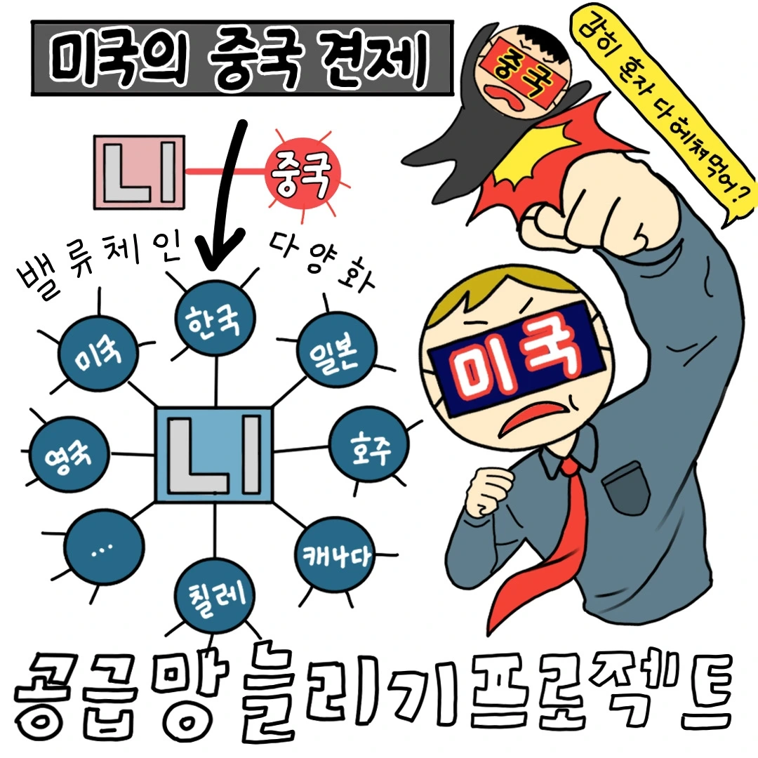 이러한 상황을 곱게 바라볼 미국이 아니죠? 미국이 본격적 중국 제재에 들어갑니다. "미래의 에너지 자원을 중국에게 맡기면 안 된다! 밸류체인을 다양화하자!"라고 말하며 "리튬 공급망 늘리기 프로젝트"에 들어갑니다. 중국이 값싸게 리튬을 공급하는 바람에 다른 나라들의 리튬 공급망이 줄어들었는데, 미국은 이제 중국에서 리튬 사 오지 말고, 조금 비싸더라도 미국과 손잡은 나라들에서 리튬을 구매할 것을 강조했습니다.
