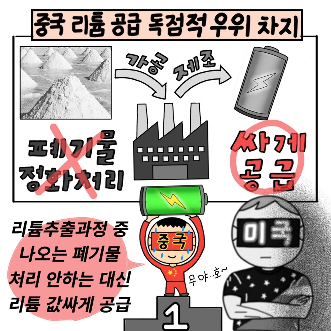 한 가지 아이러니한 것은, 리튬을 추출하는 과정 중 나오는 다량의 중금속 폐기물이 또다시 환경오염을 시킨다는 것이었죠. 그래서 리튬을 추출할 때는 추가 돈을 들여 "폐기물 처리 시설"을 설치해야 했습니다. 그런데 중국은 이 폐기물 정화처리 시설을 만들지 않고, 그만큼 리튬을 다른 나라들보다 훨씬 값싸게 공급했습니다. 결국 눈감고 환경오염을 시키며 리튬을 싸게 공급해서 리튬 공급망의 독점적 지위를 차지하게 되죠.