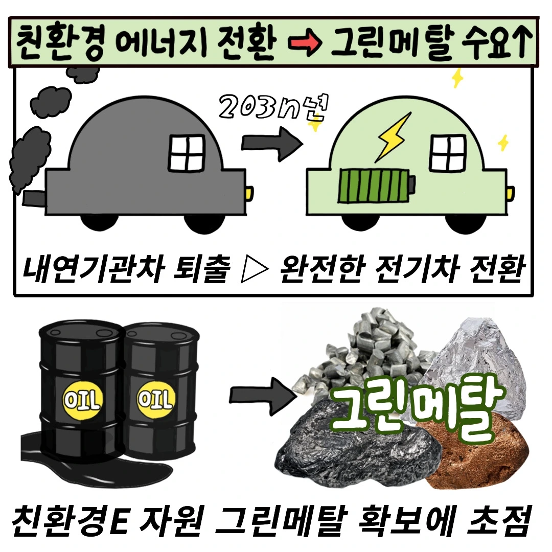 지구온난화로 인해 기후위기가 핵심 문제로 대두되면서, 많은 나라들이 환경 문제를 해결하기 위한 노력을 하고 있습니다. 그중 한 계획이 바로 친환경 에너지로의 전환인데요! 내연기관차(석유 자동차)로 인한 대기오염이 심각해지자, 미국과 EU, 중국 등 많은 나라들이 203N 년부터 내연기관차의 생산을 중단하고, 완전한 전기차로의 전환을 하겠다고 선언했습니다. 그러면서 각광받기 시작한 자원이 바로 "그린메탈"입니다.