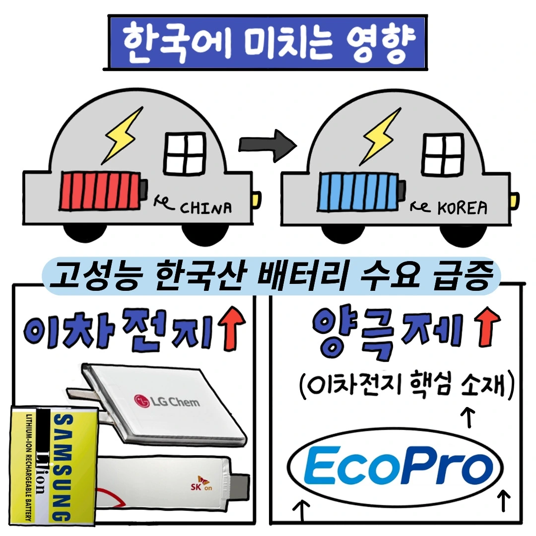 미국이 중국을 견제하면서 한국에 미친 큰 영향이 있었는데요! 바로 고성능 한국산 배터리의 수요가 급증했다는 것입니다. 완전한 고성능 배터리를 만드는 나라가 많지 않은 만큼, 한국산 배터리 수요가 더욱 늘어날 것으로 예상됩니다. 또한 이차전지를 만들 때 40%를 차지하는 핵심 소재, 양극제를 만드는 회사인 <에코프로>의 주가도 상승하게 됐죠. 리튬 공급망이 많이 늘어나면서 리튬의 가격도 하락하게 되었지만, 그럼에도 앞으로의 주요 자원이 될 만큼 지속적으로 지켜봐야 할 것 같습니다.